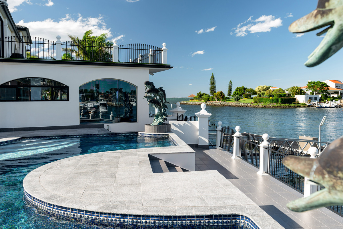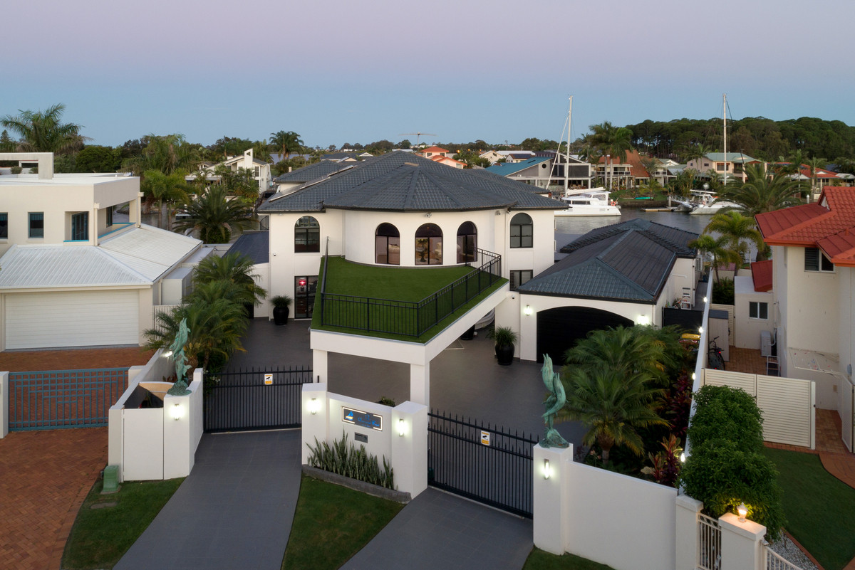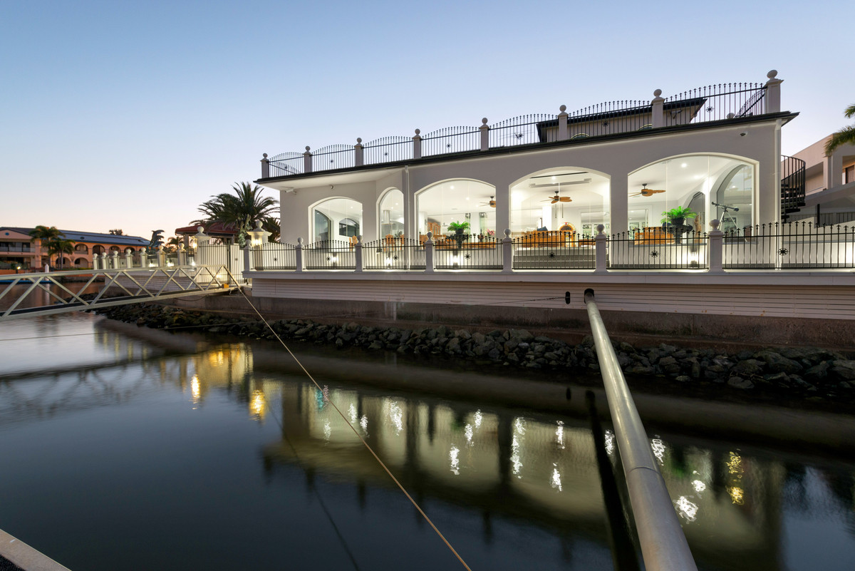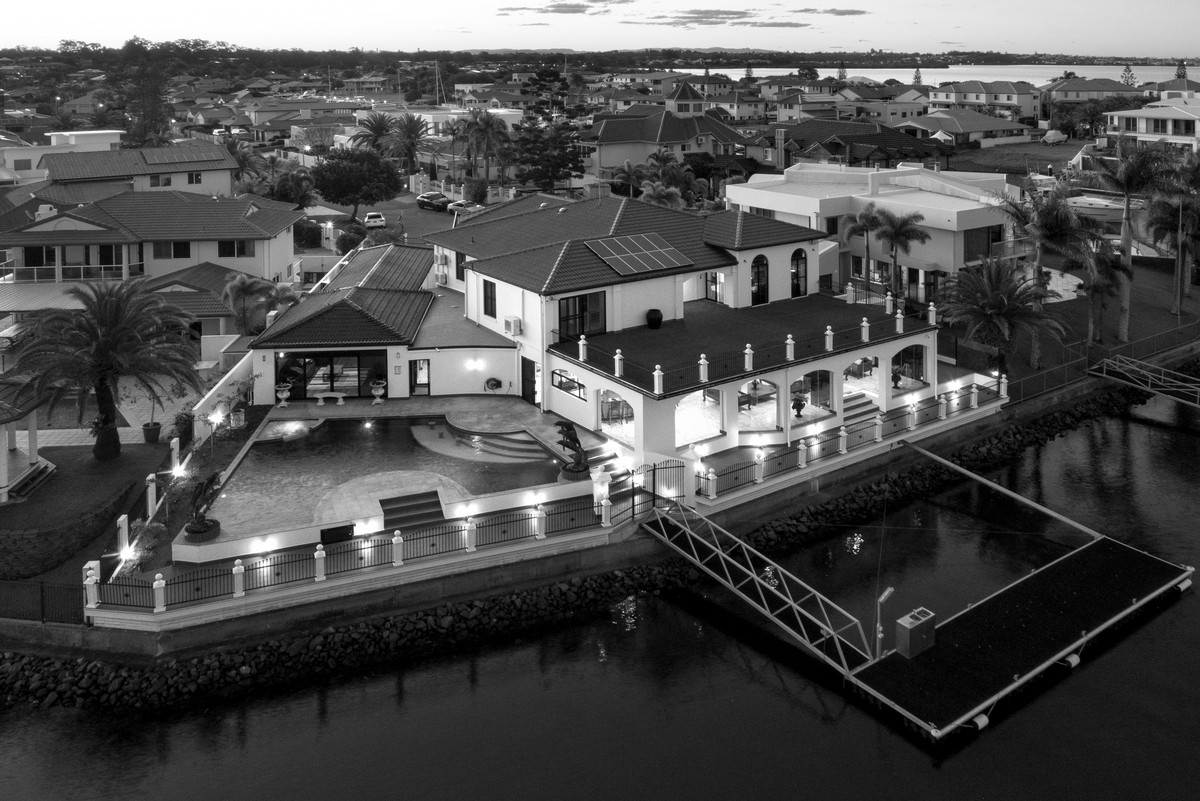 With a commanding street presence, due east aspect and a picturesque facade, move inside the grand entrance of this stunning 1,184sqm home. An open plan lower level is framed by wrap-around, floor-to-ceiling glass, revealing open water and canal views out to Moreton Bay.