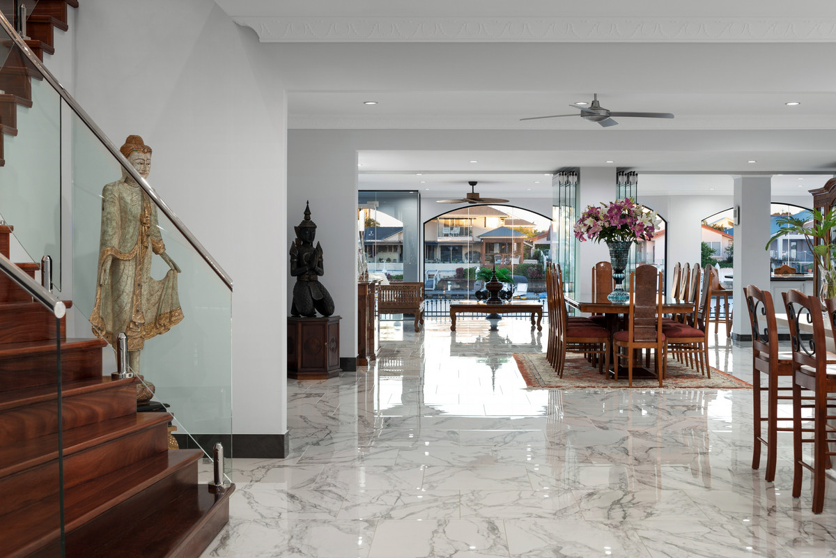 The ground floor enhances the lifestyle and calibre of this property with a large guest bedroom, home office/bedroom, laundry, gymnasium and sauna with multiple storage rooms. Sophisticated elegance in the bar then flows onto the tremendous sunroom which features the Teppanyaki cooking area and then into the large dining room and chef’s kitchen with a separate scullery and butlers pantry.