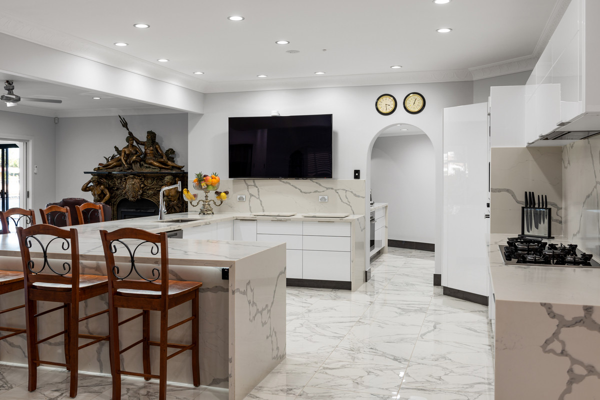Elegantly appointed with 60mm engineered stone benchtop, breakfast bar, two integrated dishwashers, five-burner Miele gas stove, 900mm oven and rangehood, steamer, plate warmer, coffee machine and sink aerator. The walk-in pantry and scullers also include a second cooktop, large sink and ample storage.