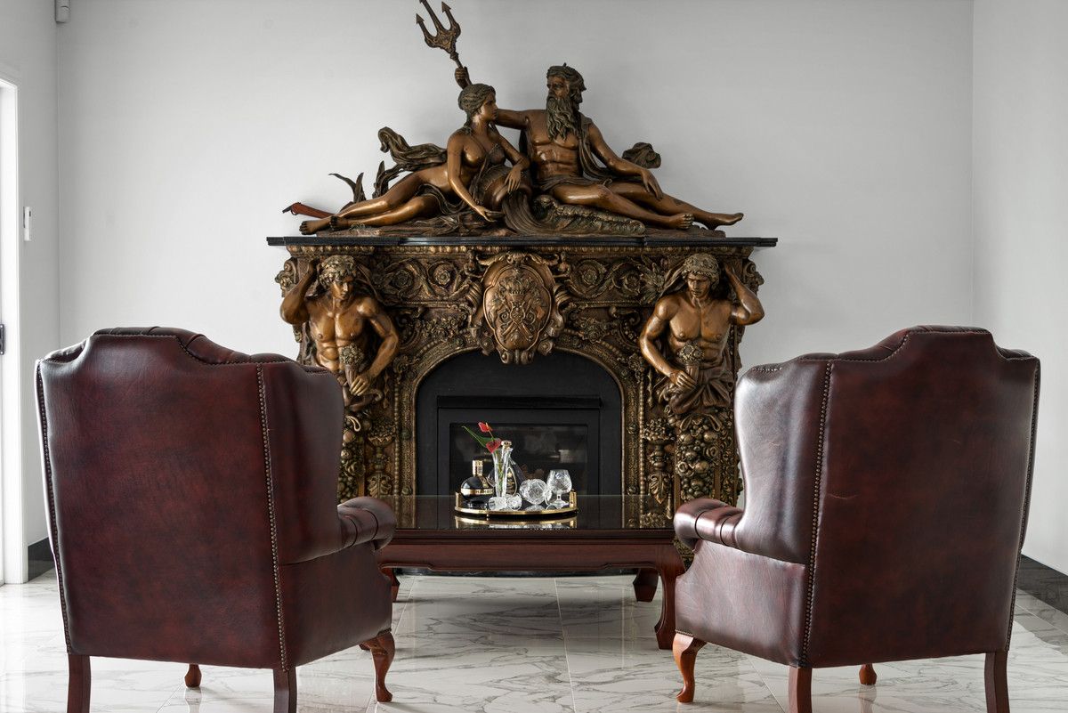 – Solid bronze & marble fireplace with a gas heater. One of only two in the world
