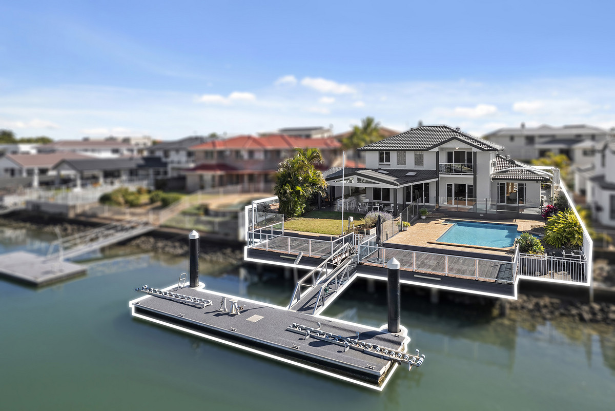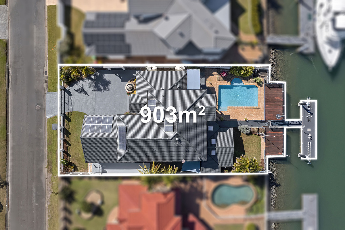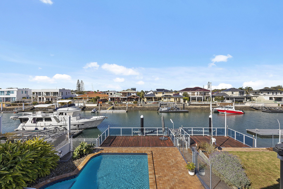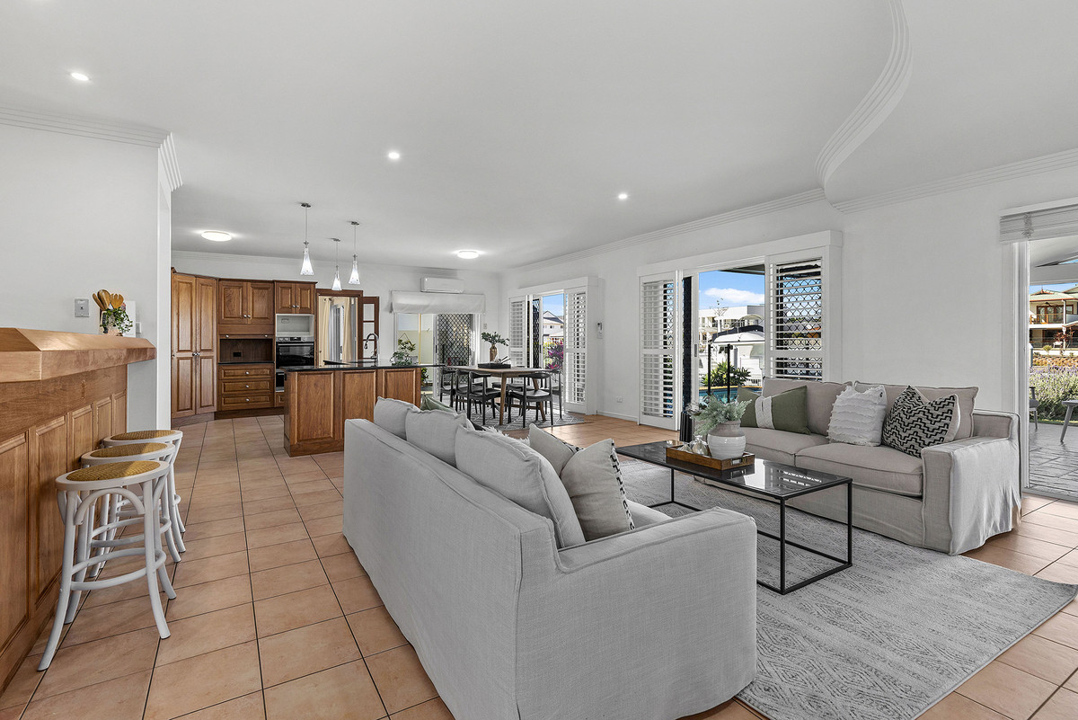 A sophisticated home completed with grand proportions, 12 Mainsail Street is a home that needs to be seen to be appreciated. Situated on a sprawling 903sqm South facing allotment, with views down the canal, this location is unmatched and one many rival. Space and light abound in the 6m soaring entry. Entering the home you’re greeted with a deluxe, gourmet kitchen featuring granite bench-tops, overlooking the oversized concrete pool and the canal.