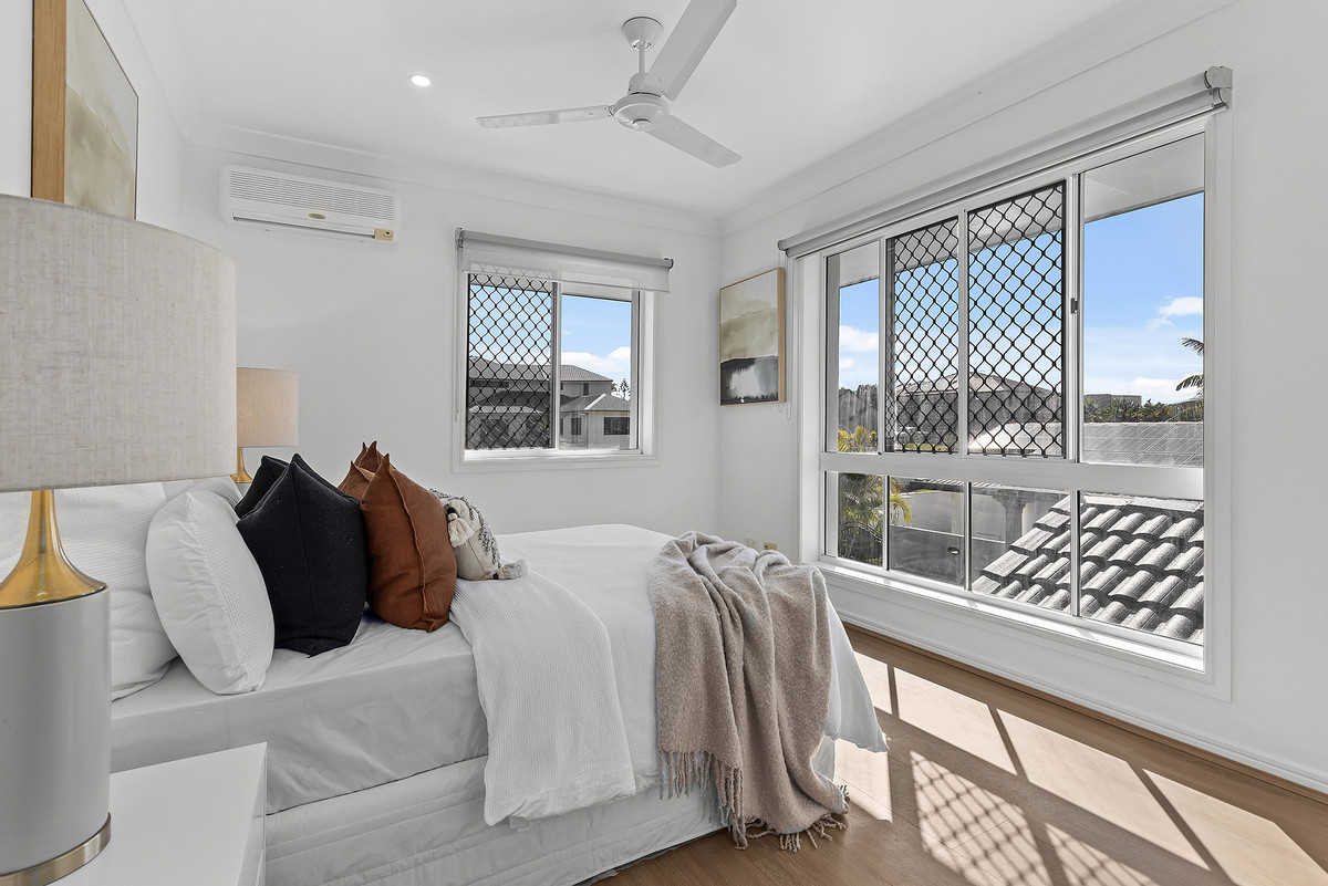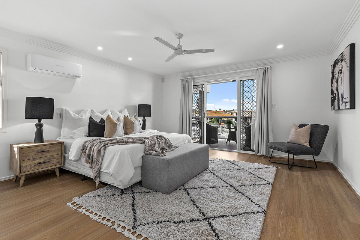 The light-filled master suite features an ensuite incorporating a double vanity, views out to the canal, a large walk-in robe with an abundance of storage and a private balcony, a perfect spot for that morning coffee or afternoon wine.