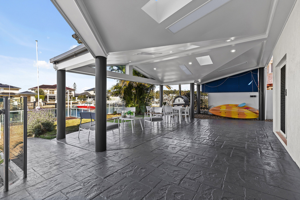 The downstairs living area flows seamlessly to the covered alfresco area with skylights ensuring the space is filled with natural light all year round. The backyard space is a rarity in this exclusive locale, and 12 Mainsail has plenty of it. With its perfect position next to the pool, the yard also connects to a second outdoor entertainment area which offers gracious views of each end of the canal.