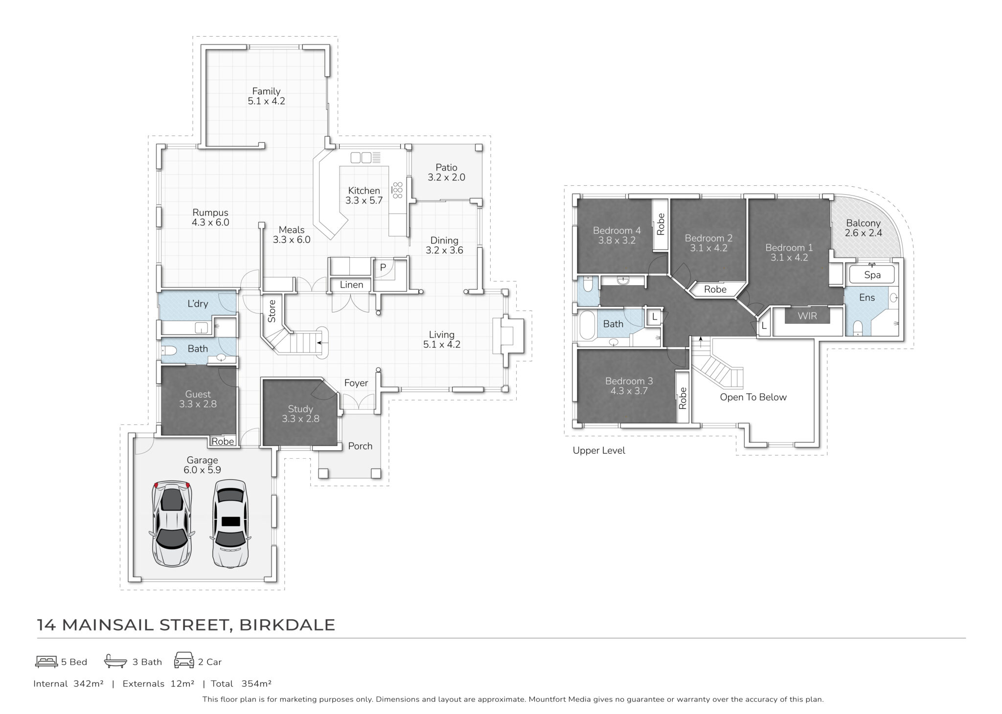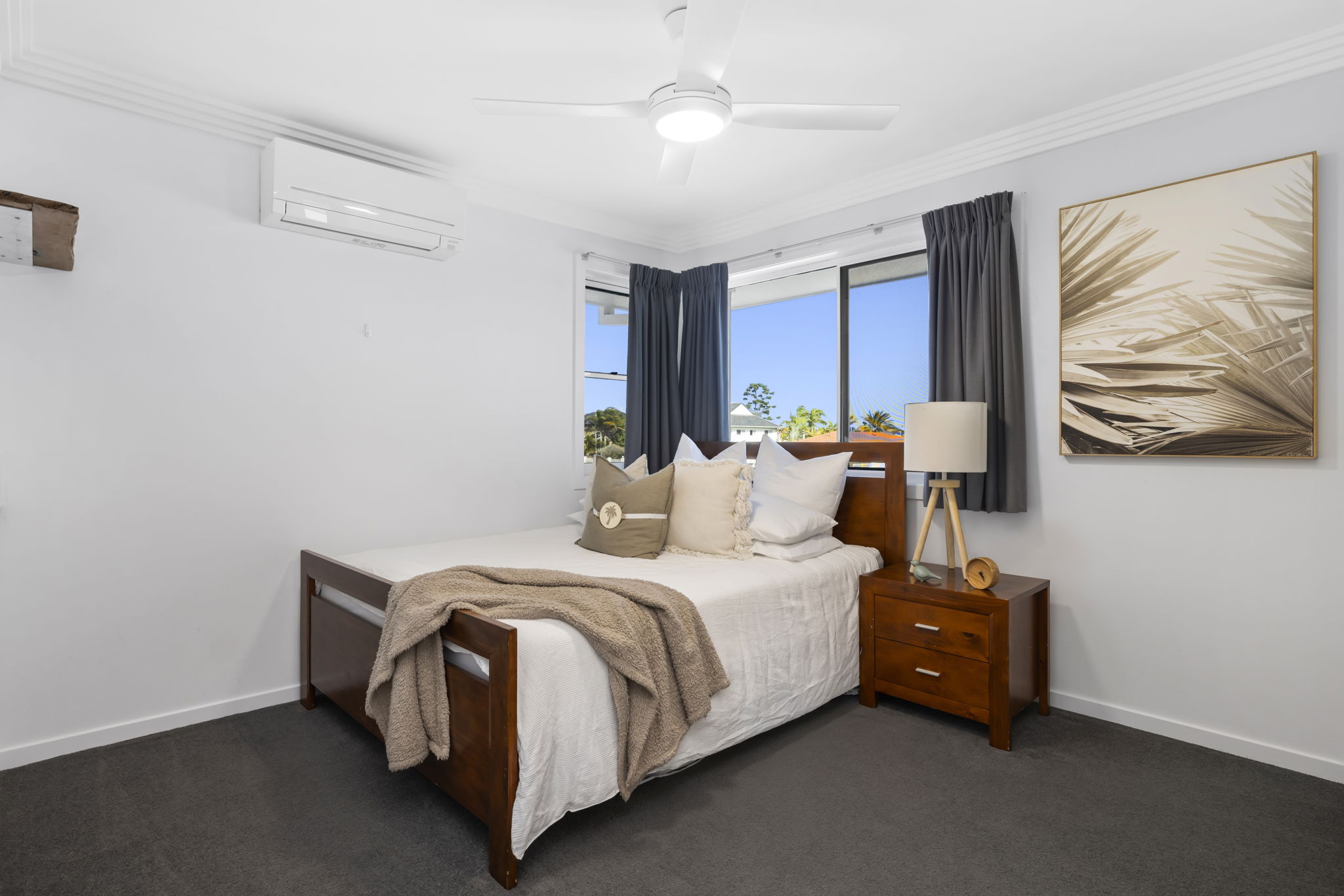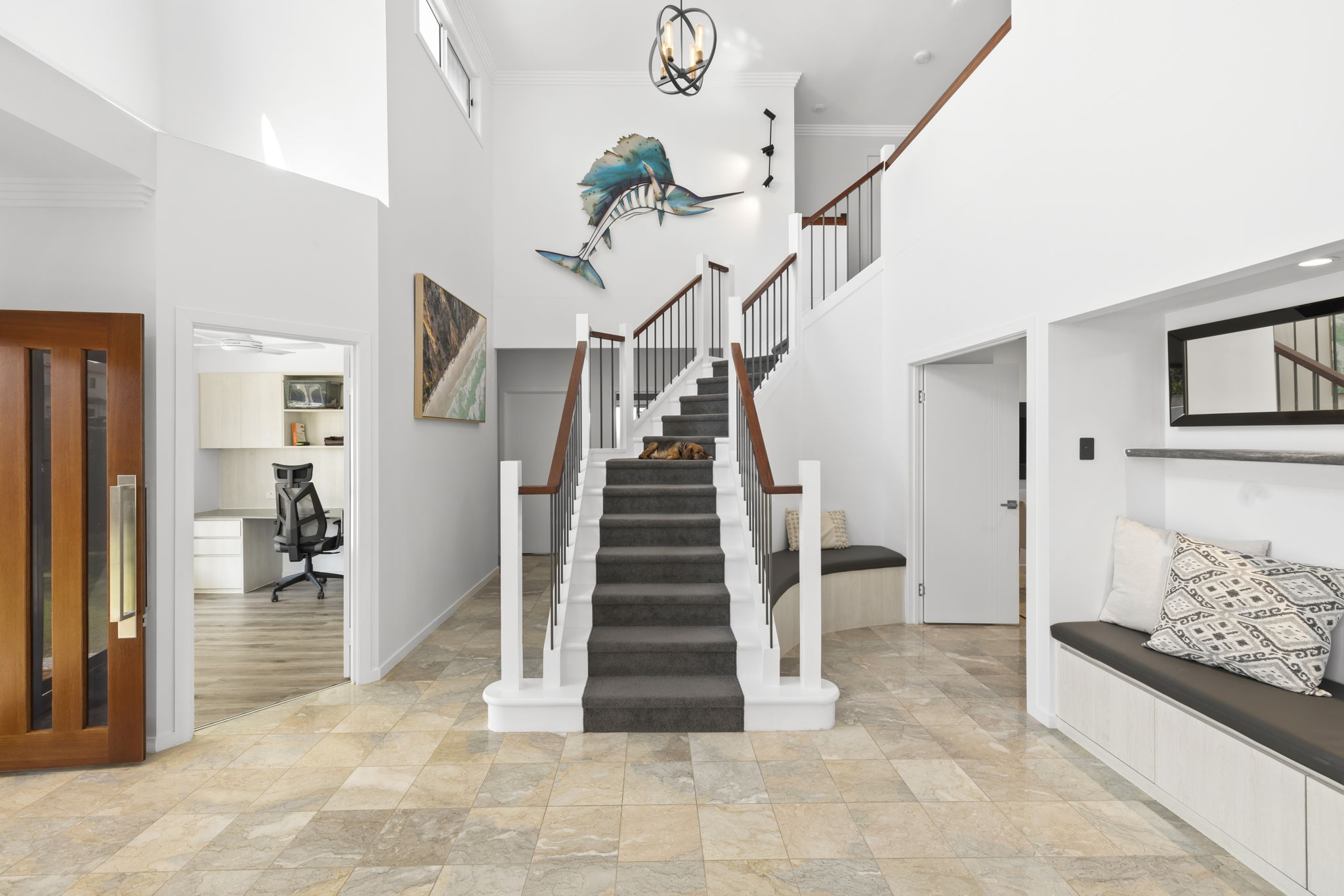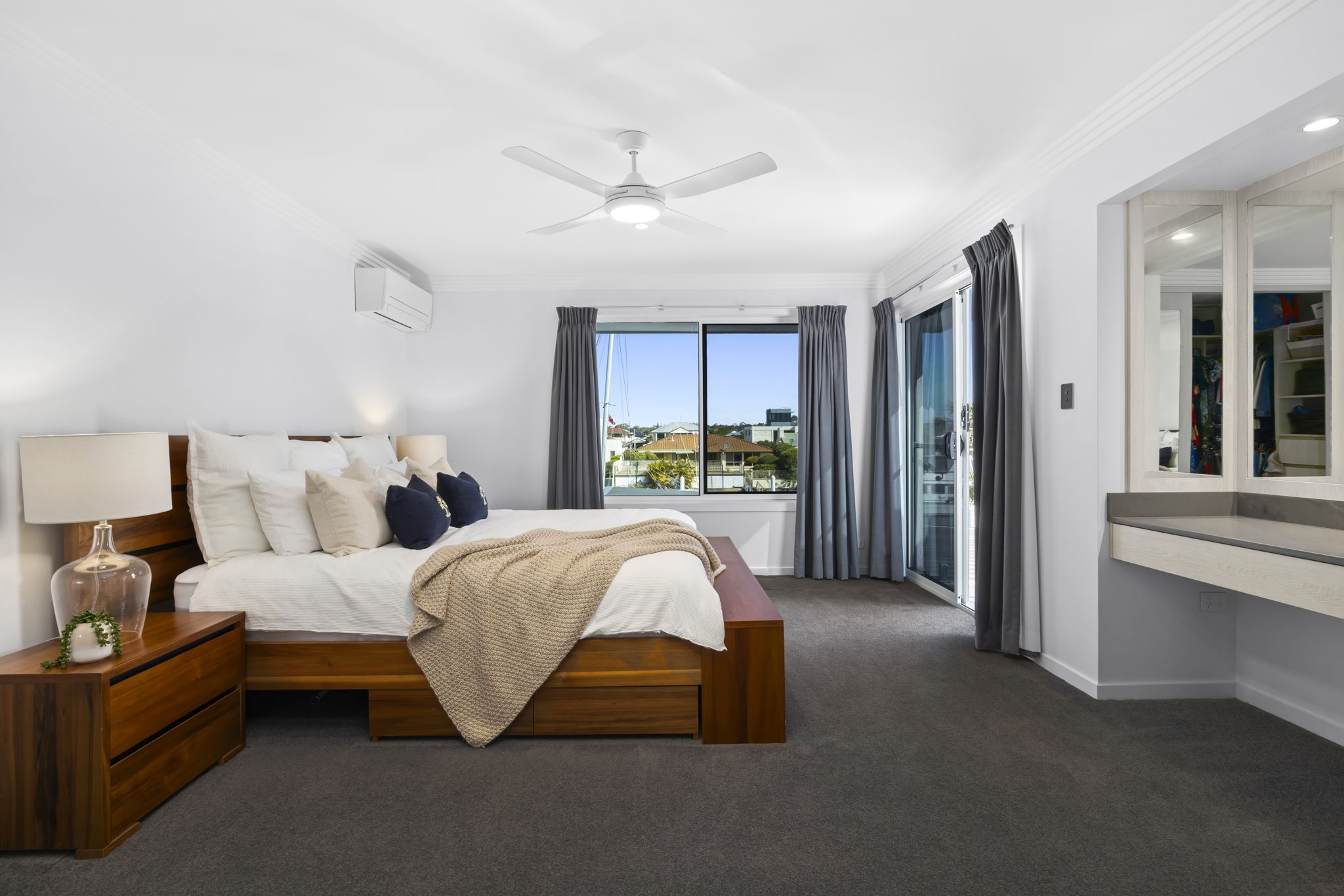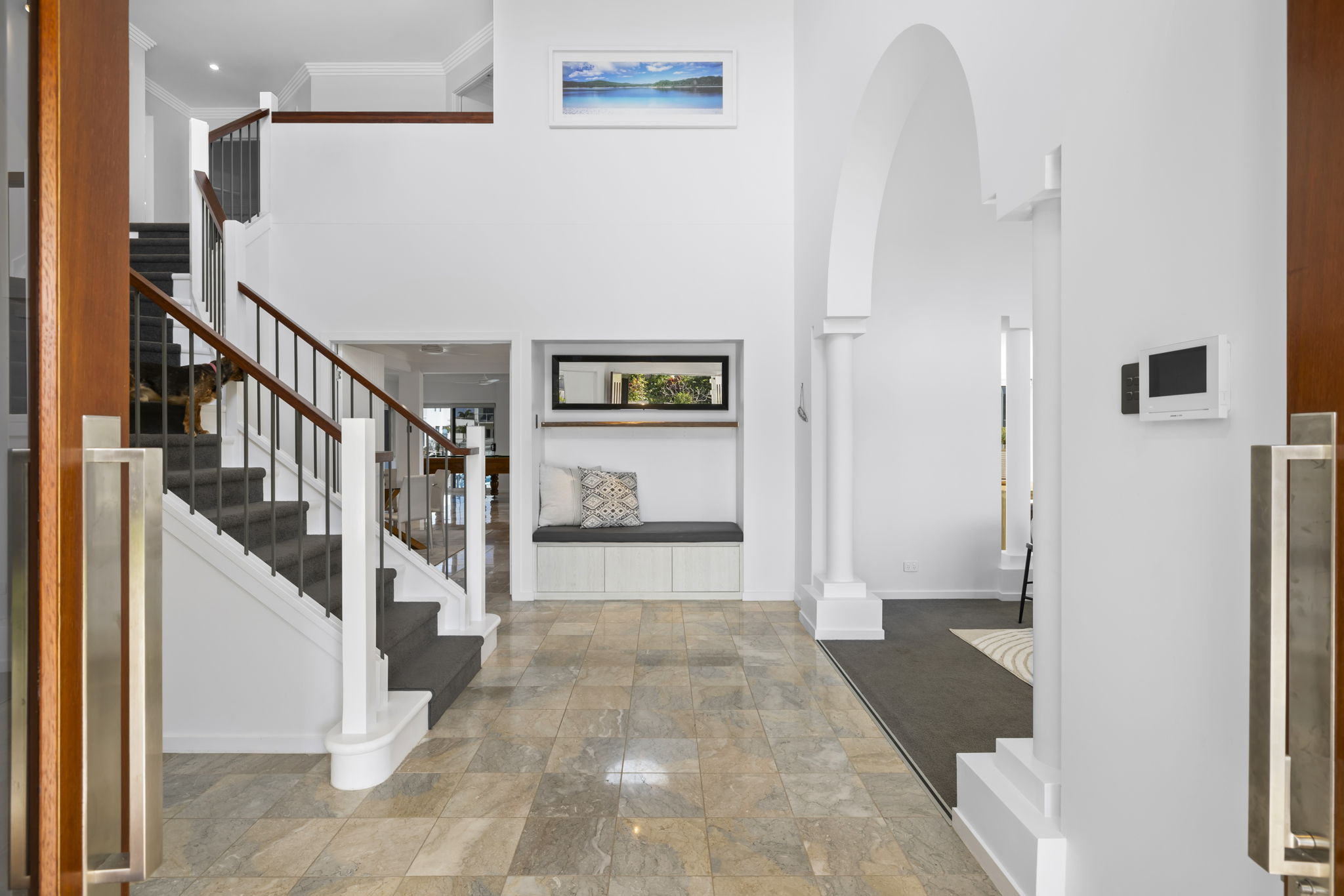 The layout is ideal for growing families and multi-generational living, offering five bedrooms plus a separate study. A ground-floor guest suite with its own ensuite is perfect for visitors, older children, or extended family. Upstairs, the primary suite captures tranquil water views and includes a walk-in robe, indulgent ensuite and private balcony. Three additional bedrooms with built-in robes are oversized and serviced by a well-appointed family bathroom. All bedrooms are air conditioned, with ceiling fans throughout for year-round comfort.