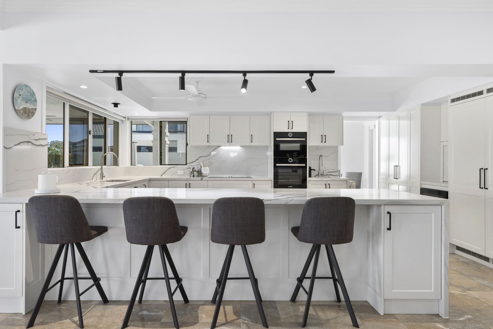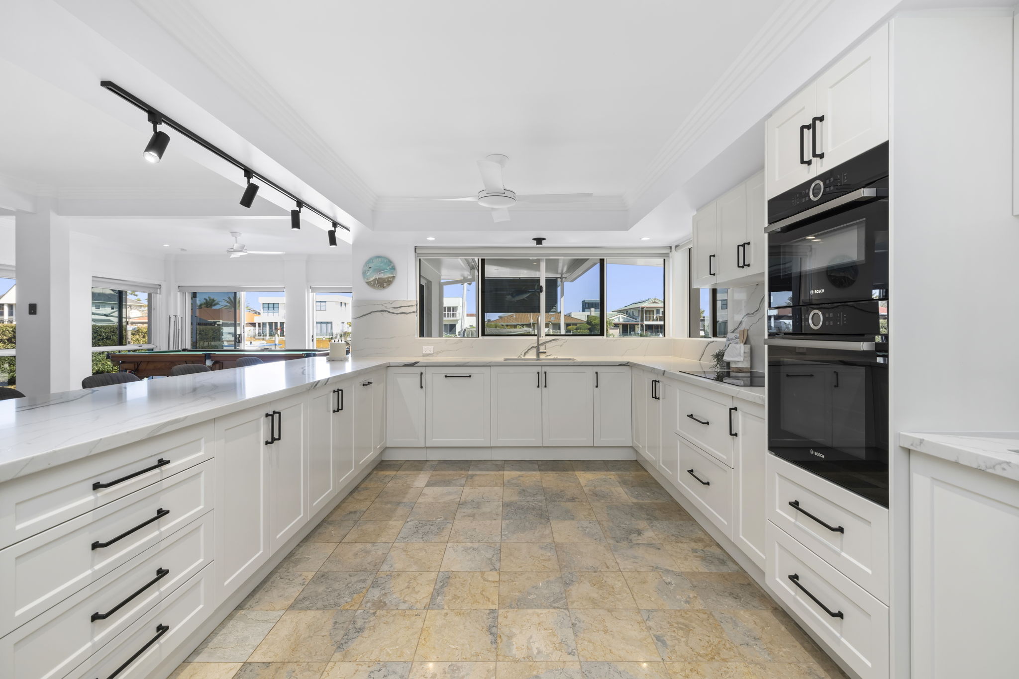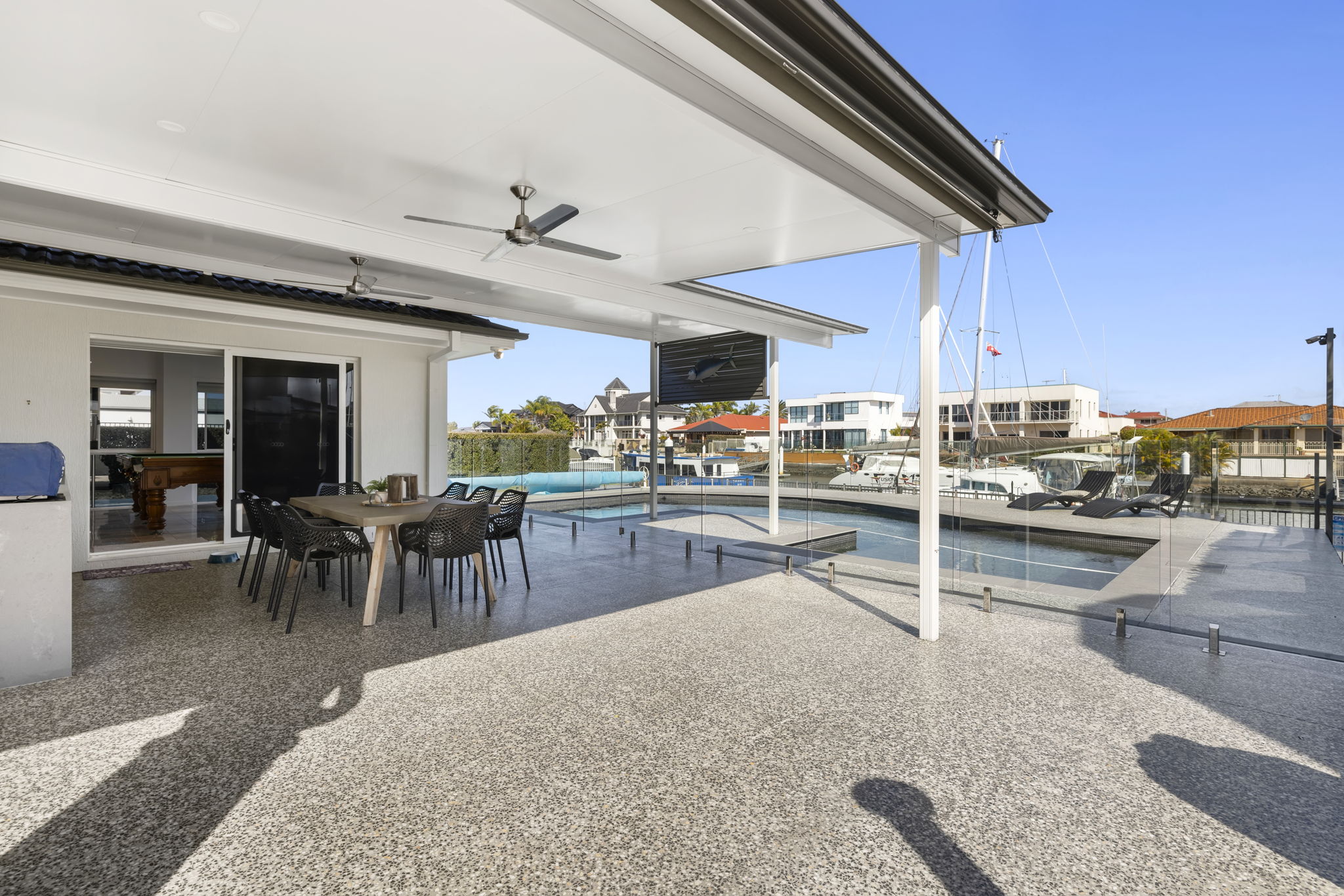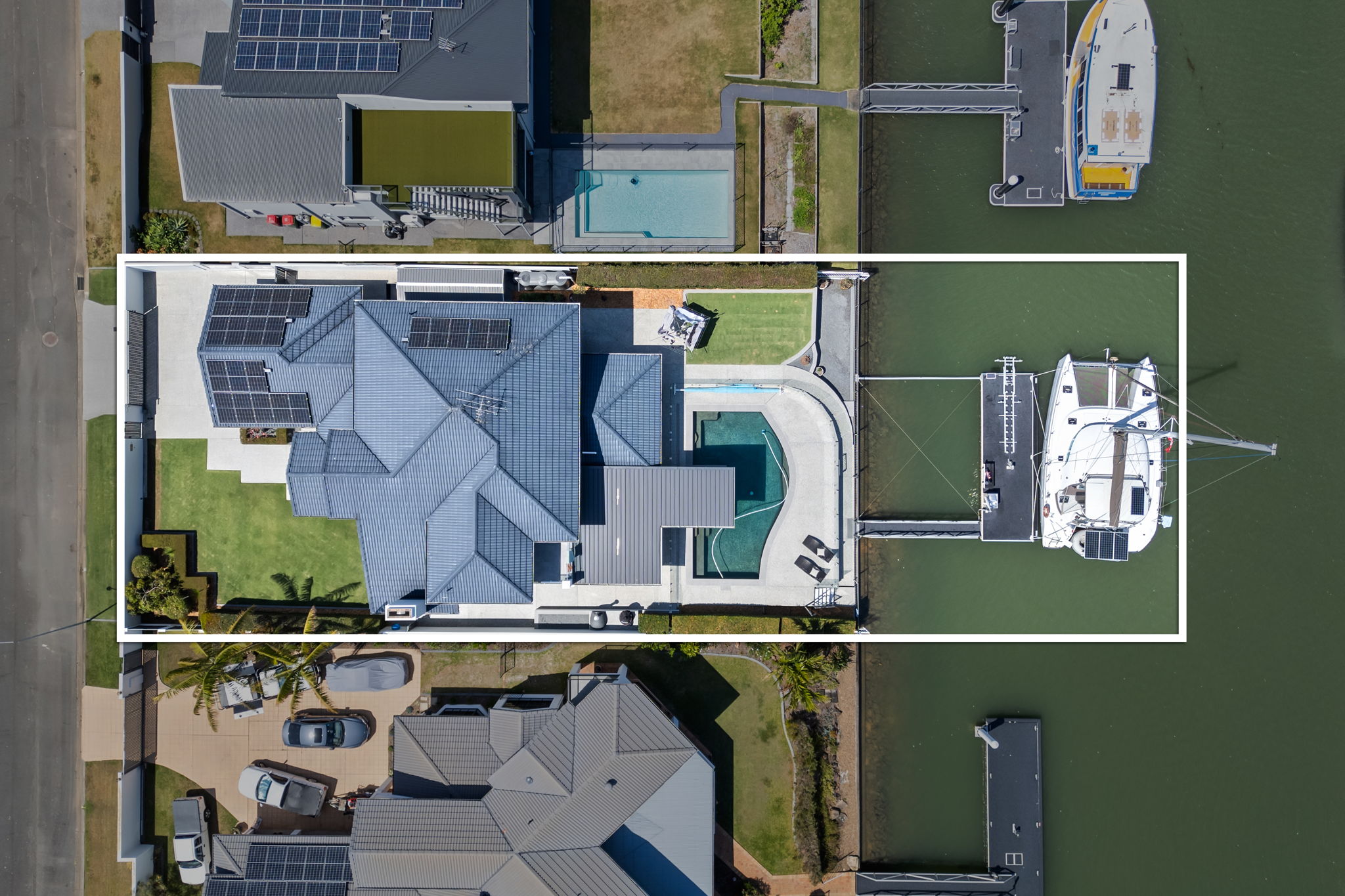 Outside, life feels like a private resort. Spend weekends poolside beside the heated 80,000 L pool, entertain with the outdoor kitchen and pizza oven, then step straight onto your fully serviced pontoon with power and water for effortless boating days on the bay. Practical luxuries complete the package, including solar power, 3,000 L water tanks, CCTV, Crimsafe screening, and secure parking behind an electric gate with full perimeter fencing and keyed or automated locks.