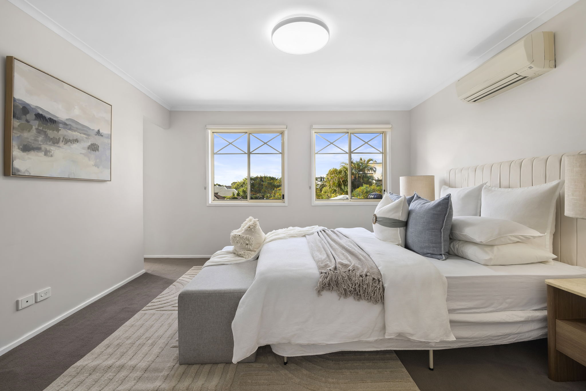Five bedrooms are thoughtfully positioned across the two levels, with one on the ground floor ideal for guests or a home office. Upstairs, the north-facing primary suite features a walk-in robe, ensuite with underfloor heating and a private balcony, capturing natural light and breezes. All other bedrooms are fitted with built-in robes and air conditioning to ensure year-round comfort. The additional upstairs bedrooms are serviced by a family bathroom, while a powder room is conveniently located on the lower level.