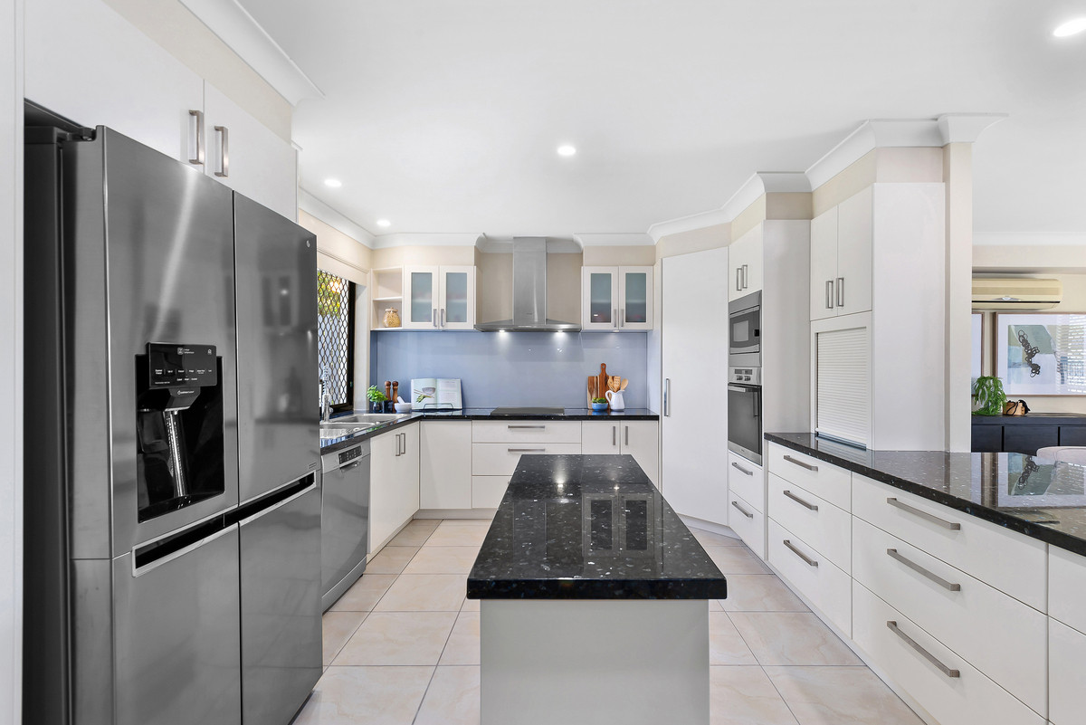 The gourmet kitchen boasts quality appliances, Granite benchtops and more storage space than you could dream of. Sprawling off the kitchen, you will find the living, dining room, family/games room and bar, which offer plenty of space for the whole family alike. Accessible via large glass sliding doors, a covered alfresco area is steps from the dining space and extends the home’s entertainment options outside equipped with an outdoor kitchen overlooking the perfectly landscaped backyard.