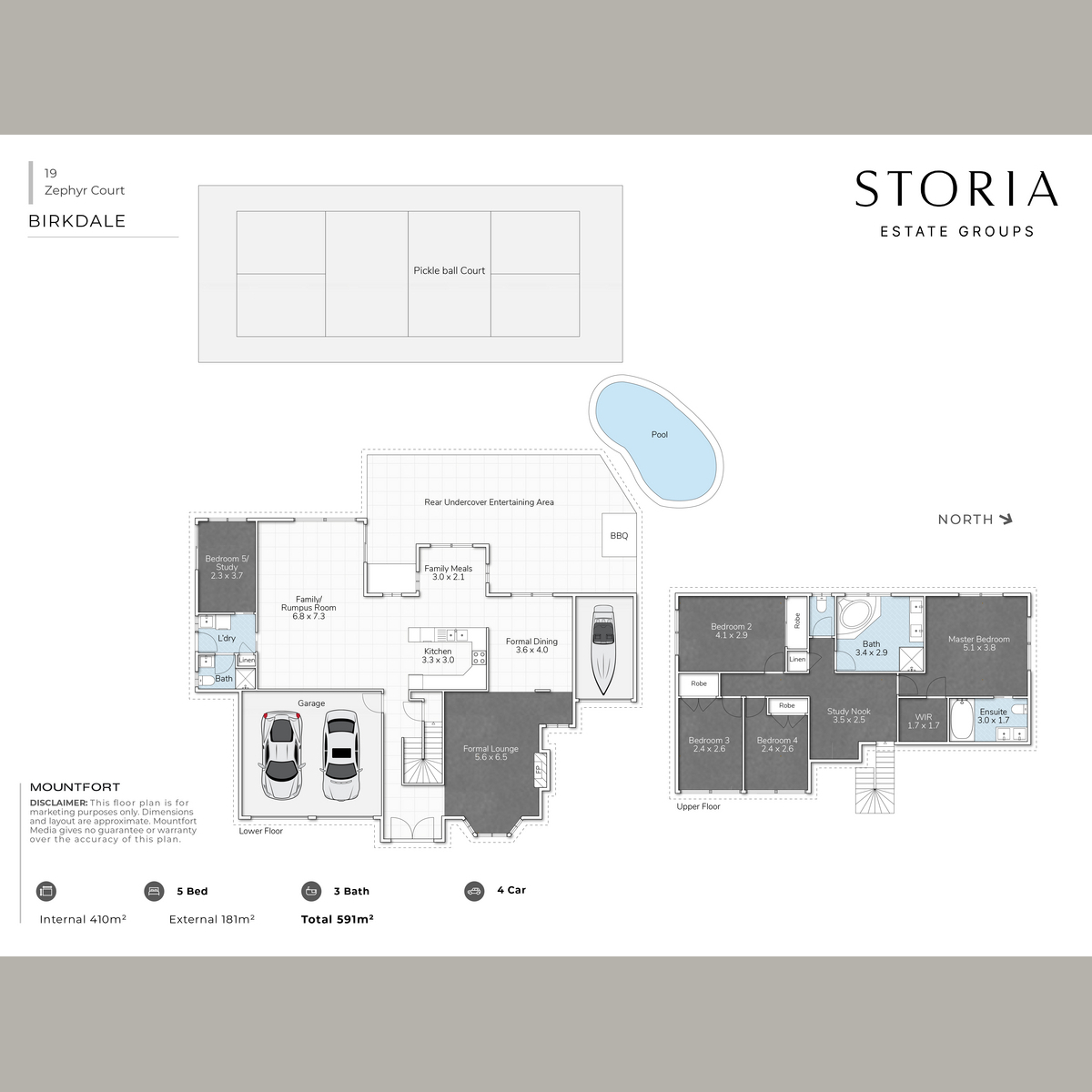 – 4 bedrooms + study/5th bedroom option with separate entry