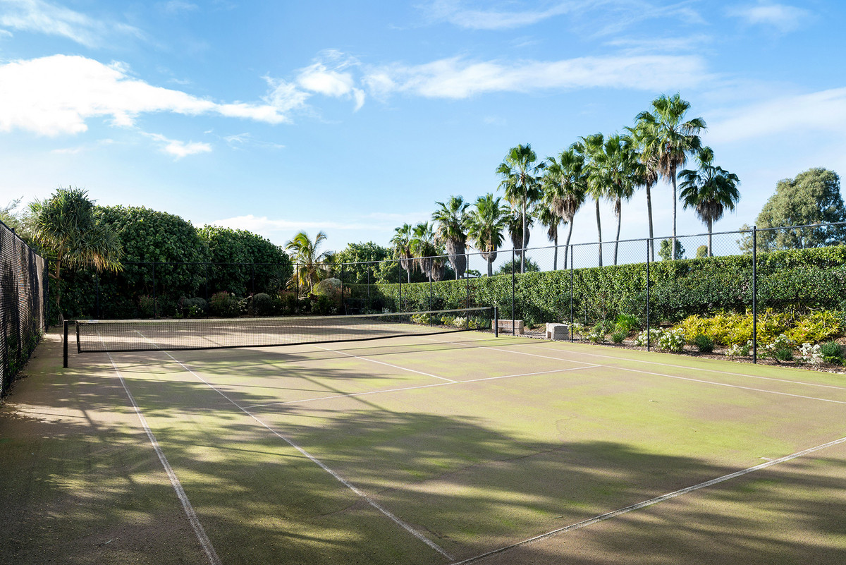 The property features a resort style pool with adjoining gas-heated spa, both overlooking the champion-size tennis court with direct sea views, perfect for year-round enjoyment. The outdoor shower and storage room under the pool add to the convenience.