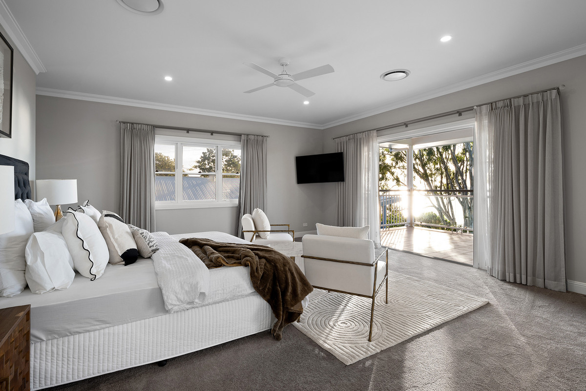 Boasting one of the Redlands’ highest elevations, enjoy 180-degree bay island views from both levels. With 3m ceilings downstairs and 2.7m ceilings upstairs, the home exudes a sense of spaciousness and grandeur. Enjoy cooking in the designer kitchen featuring 40mm engineered stone bench tops, top-range SMEG oven, and an integrated SMEG dishwasher. The walk-in butler’s pantry and views to Stradbroke Island make it a chef’s dream.