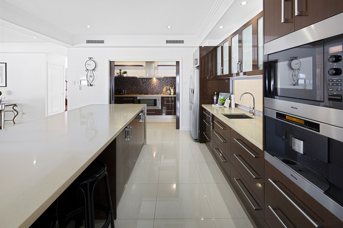 Enter into a light-filled void, leading you through to the heart of the home. Taking centre stage in the living spaces, the kitchen boasts a large Caesarstone island bench, features a generously-sized butlers pantry offering a double sink, European appliances, it has everything entertainers and cooks need to host a fabulous gathering.