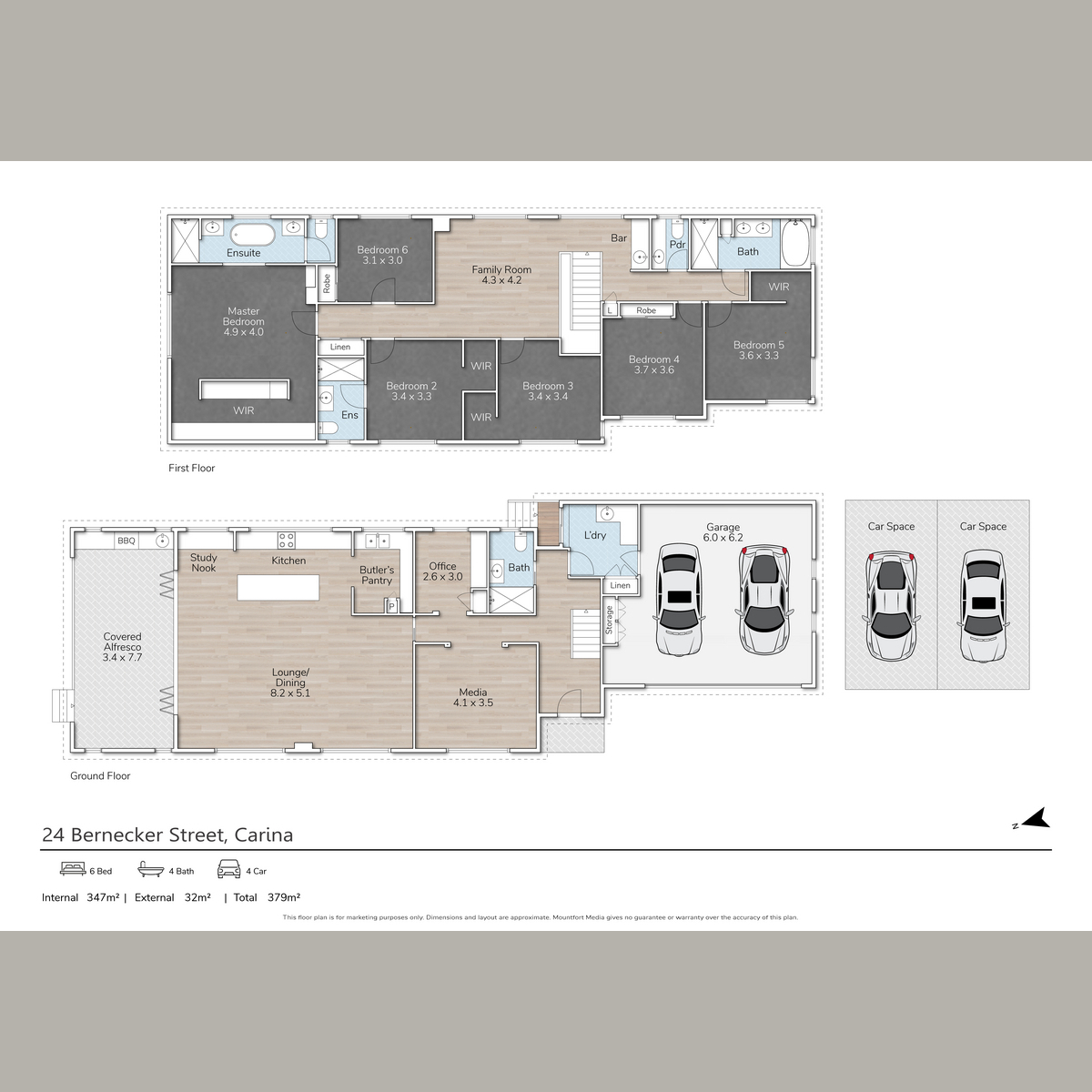 – Six bedrooms upstairs, including a luxurious primary suite with dual walk-in robes