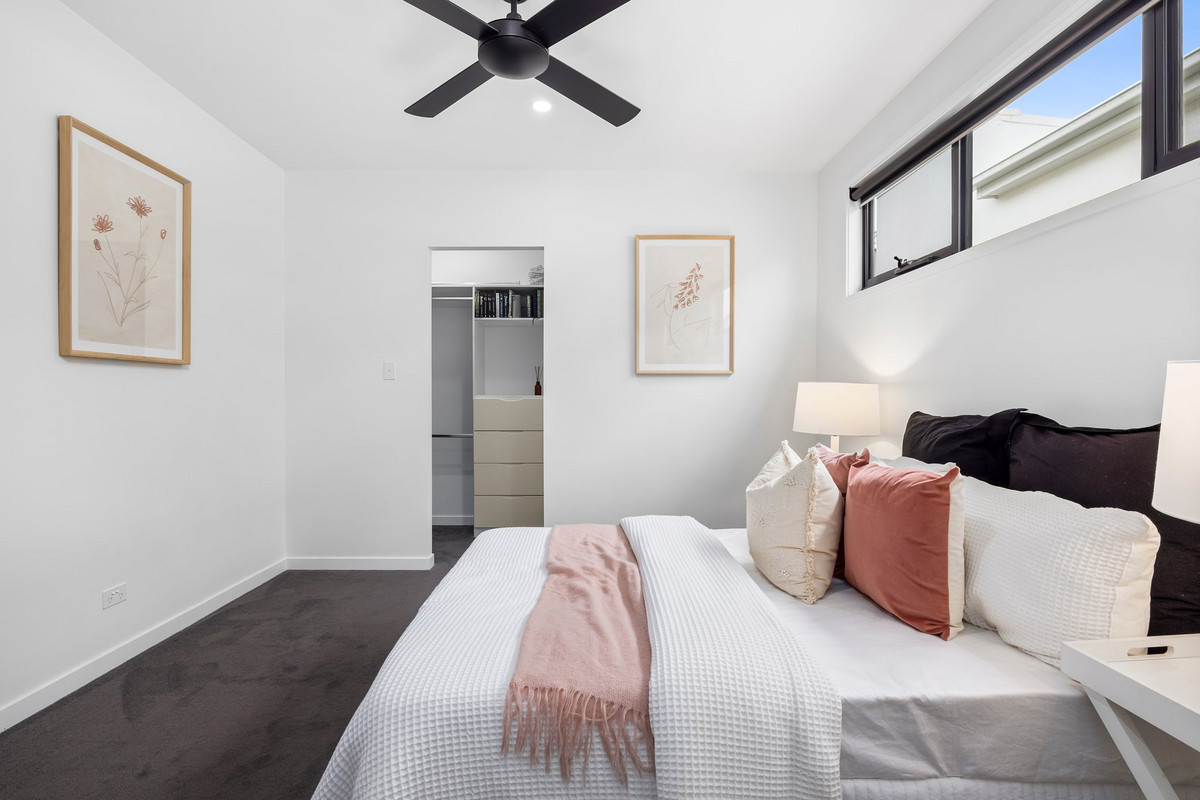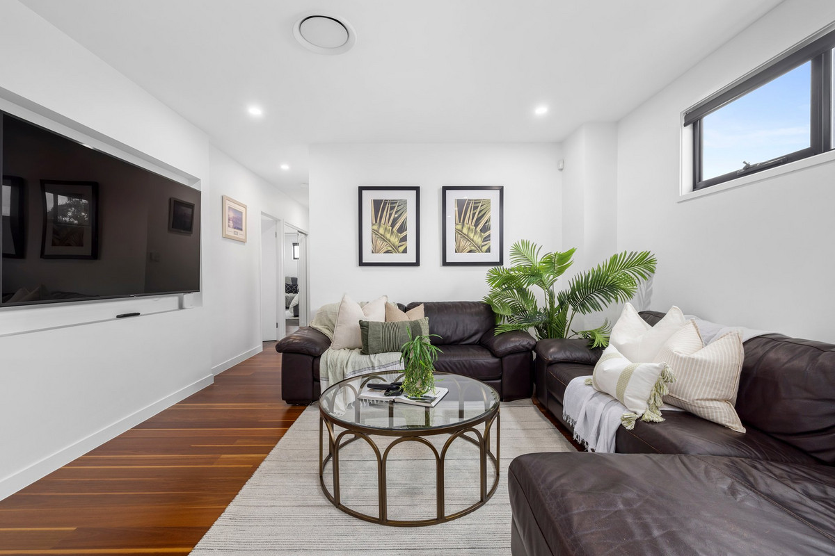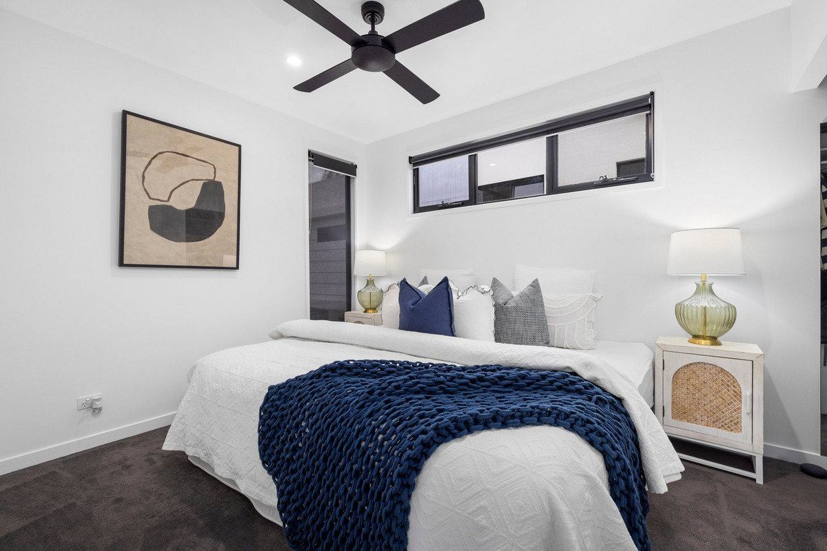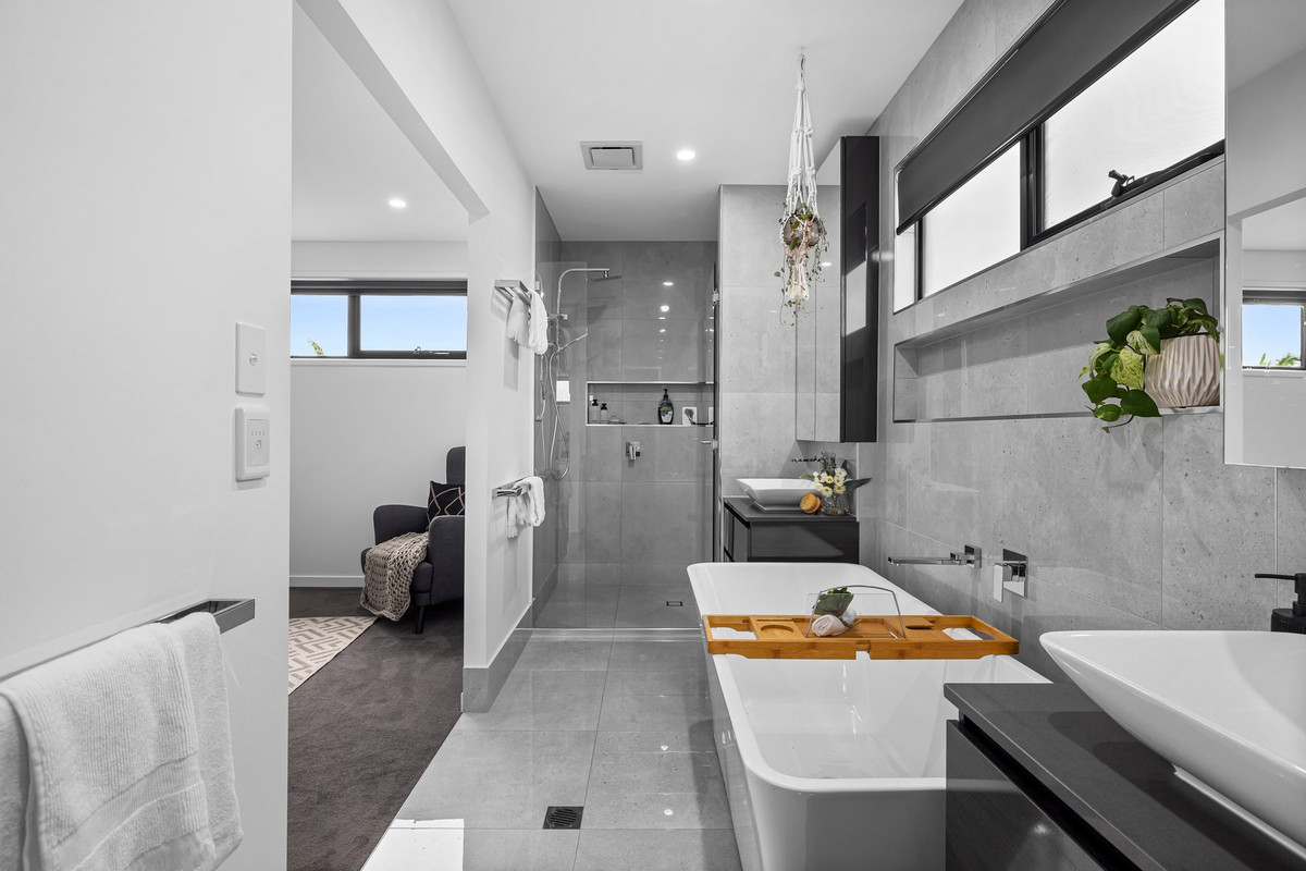 The primary suite is positioned privately at the rear and is nothing short of a sanctuary. It features dual walk-in robes and a luxe ensuite with a freestanding bath, dual vanities, floor-to-ceiling tiles, and calming tones throughout. One of the other upstairs bedrooms also enjoys its own private ensuite – an ideal setup for guests, teens, or multigenerational living.
