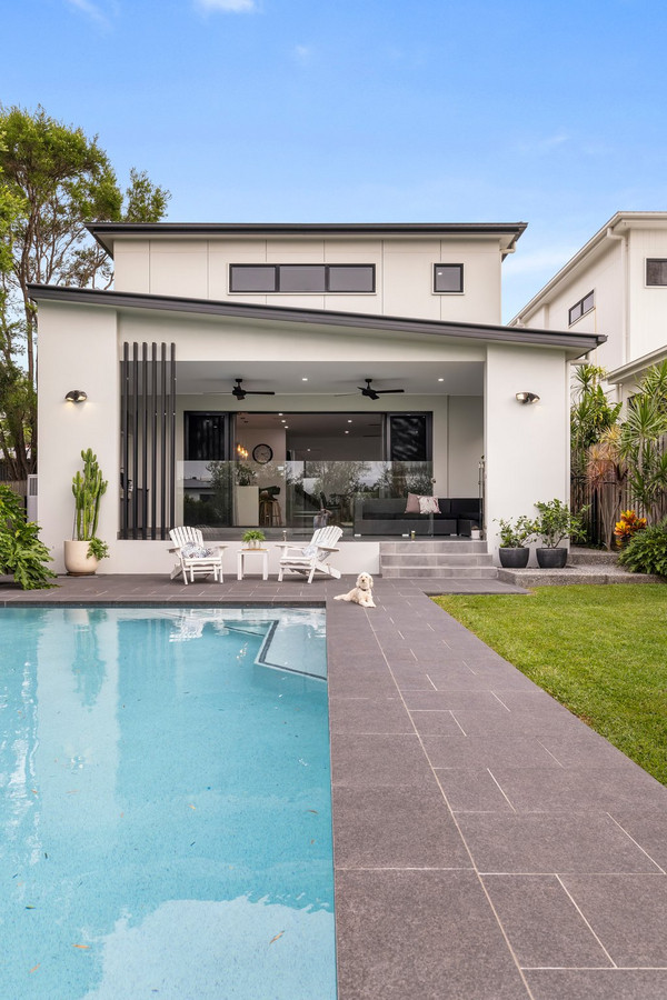 The living and dining space flows effortlessly outdoors through glass sliders to a covered alfresco area – complete with a built-in BBQ kitchen, ceiling fans, and stylish tiled flooring. It’s a natural extension of the home, perfect for entertaining year-round. Beyond the glass fencing, a stunning magnesium salt in-ground pool sparkles against a backdrop of low-maintenance landscaping and a lush strip of lawn, ideal for kids or pets.