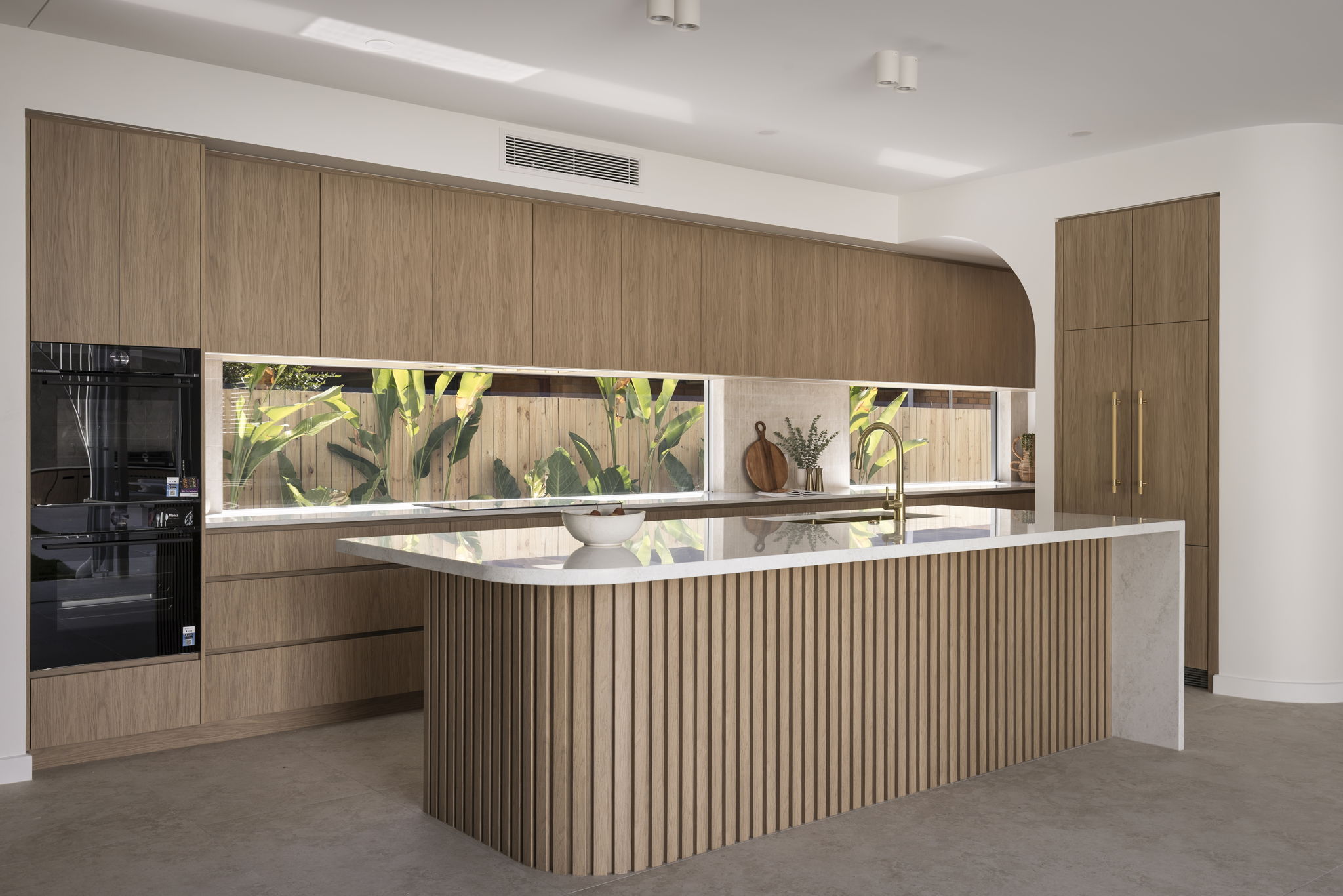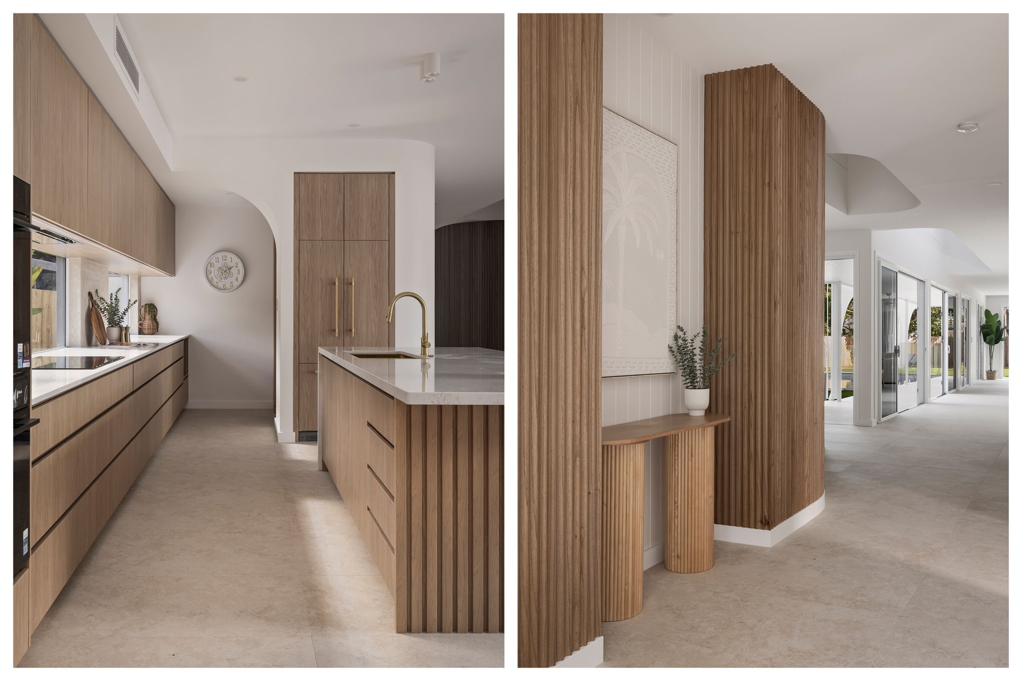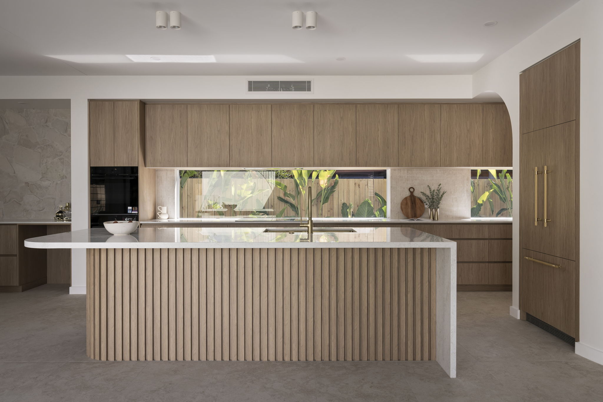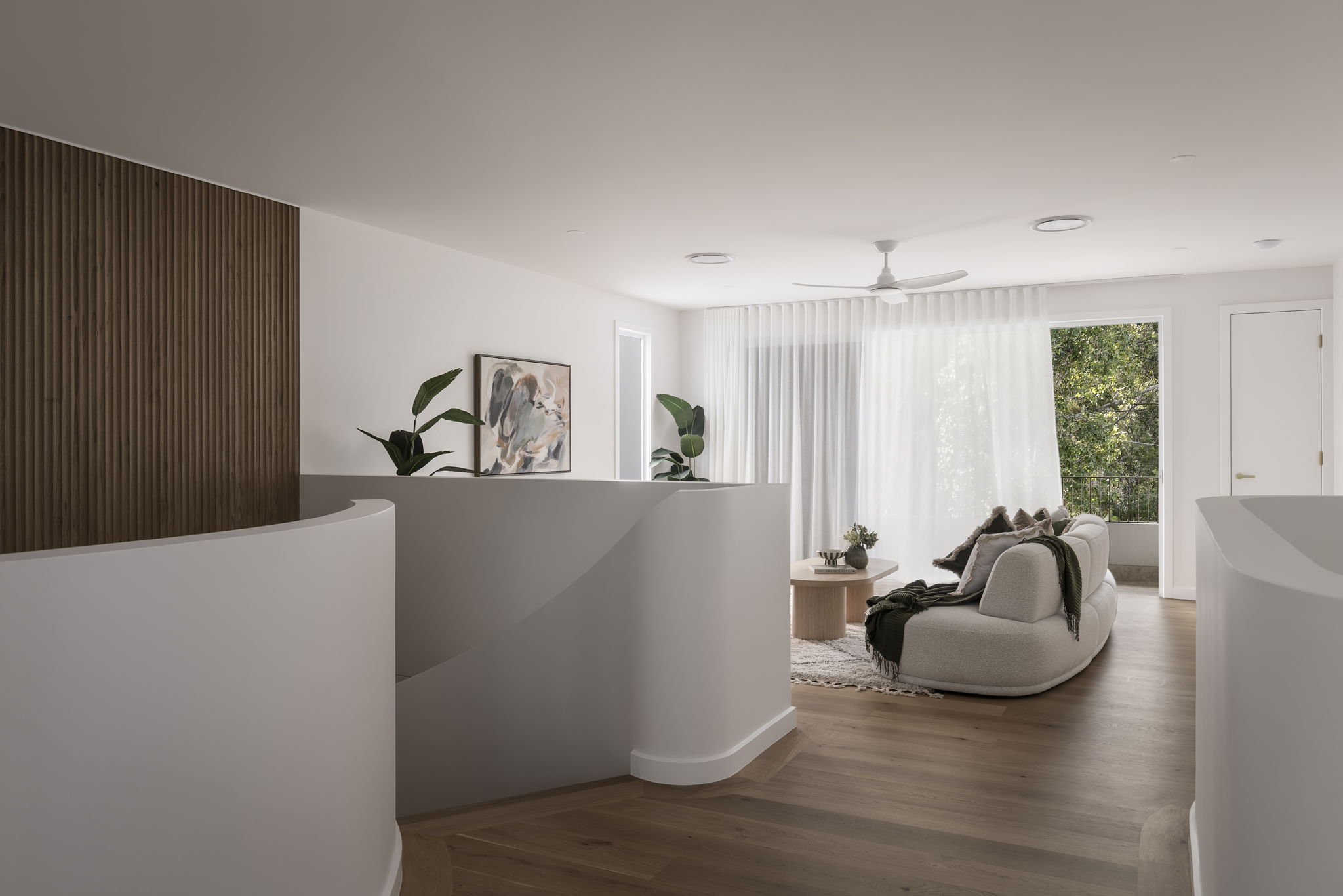 Curved walls and high arches set the soft tone of the home complimented by the expansive voids and flowing lines that create a sense of volume while remaining deeply connected to family function. The mixture of carefully curated tones and textures with the Boston Oak fluting, porcelain tiles. French Oak flooring and stone feature walls create warmth and personality to each space. The striking spiral staircase serves as a centrepiece to the home, showcasing the purposeful and seamless design transitioning between spaces.