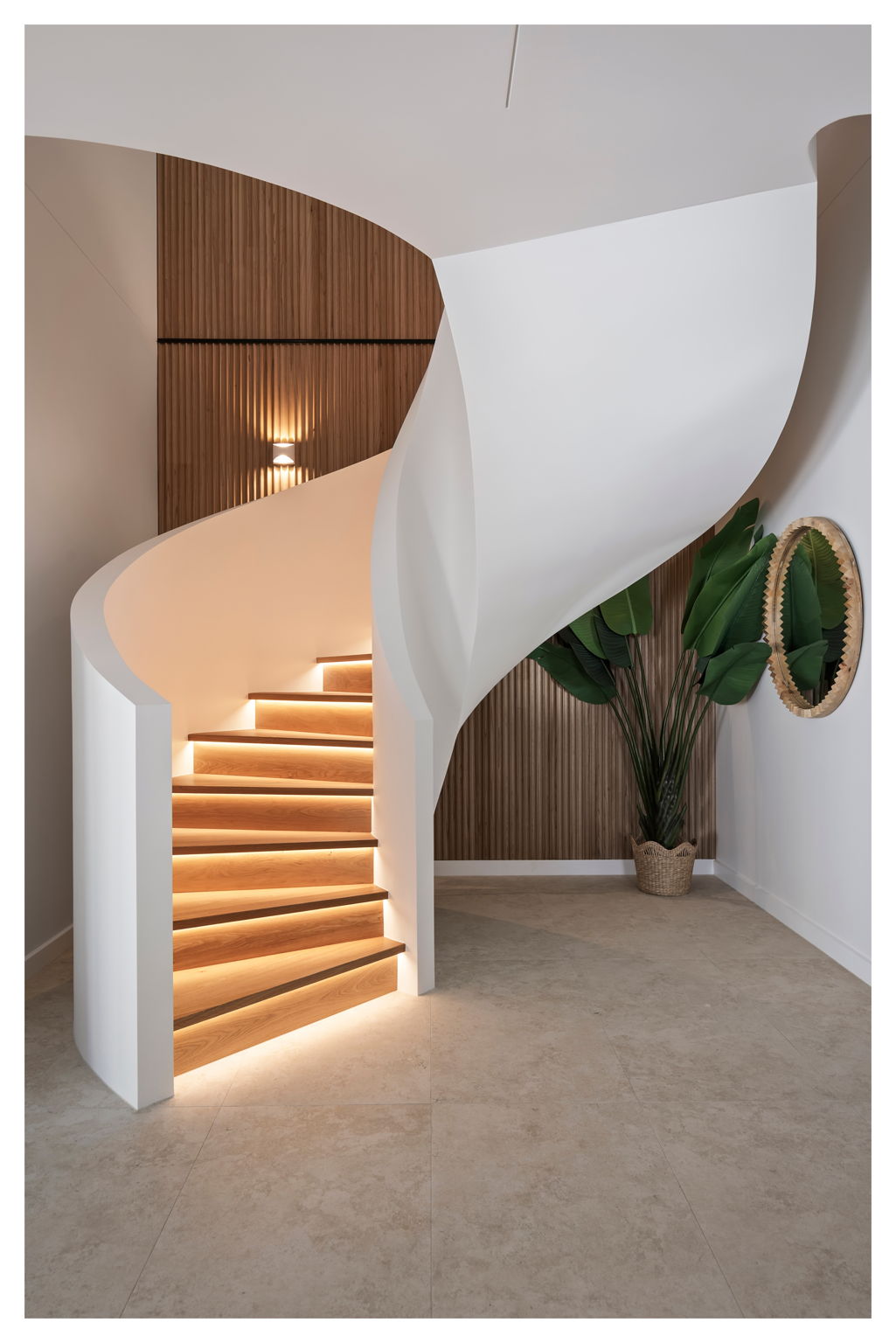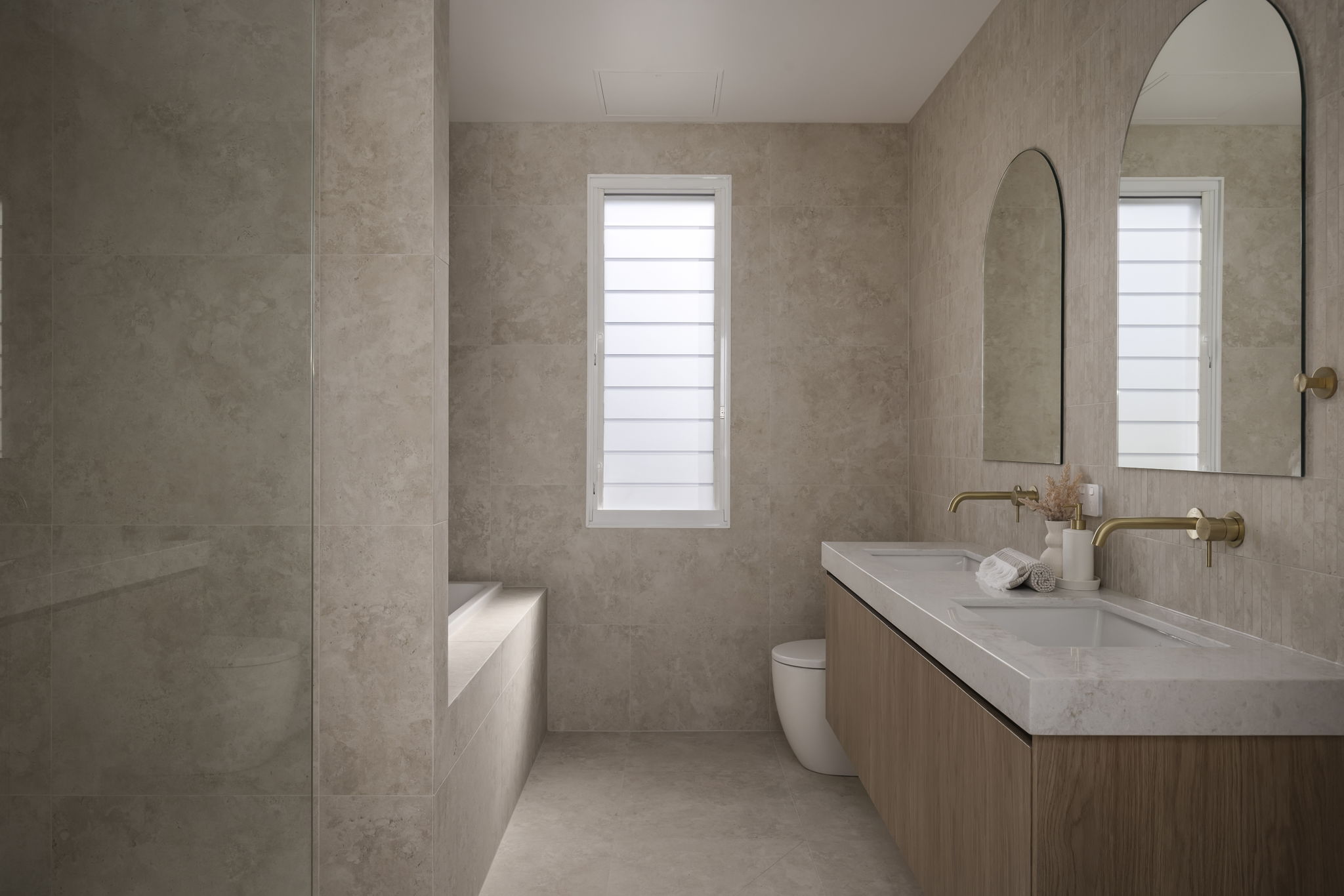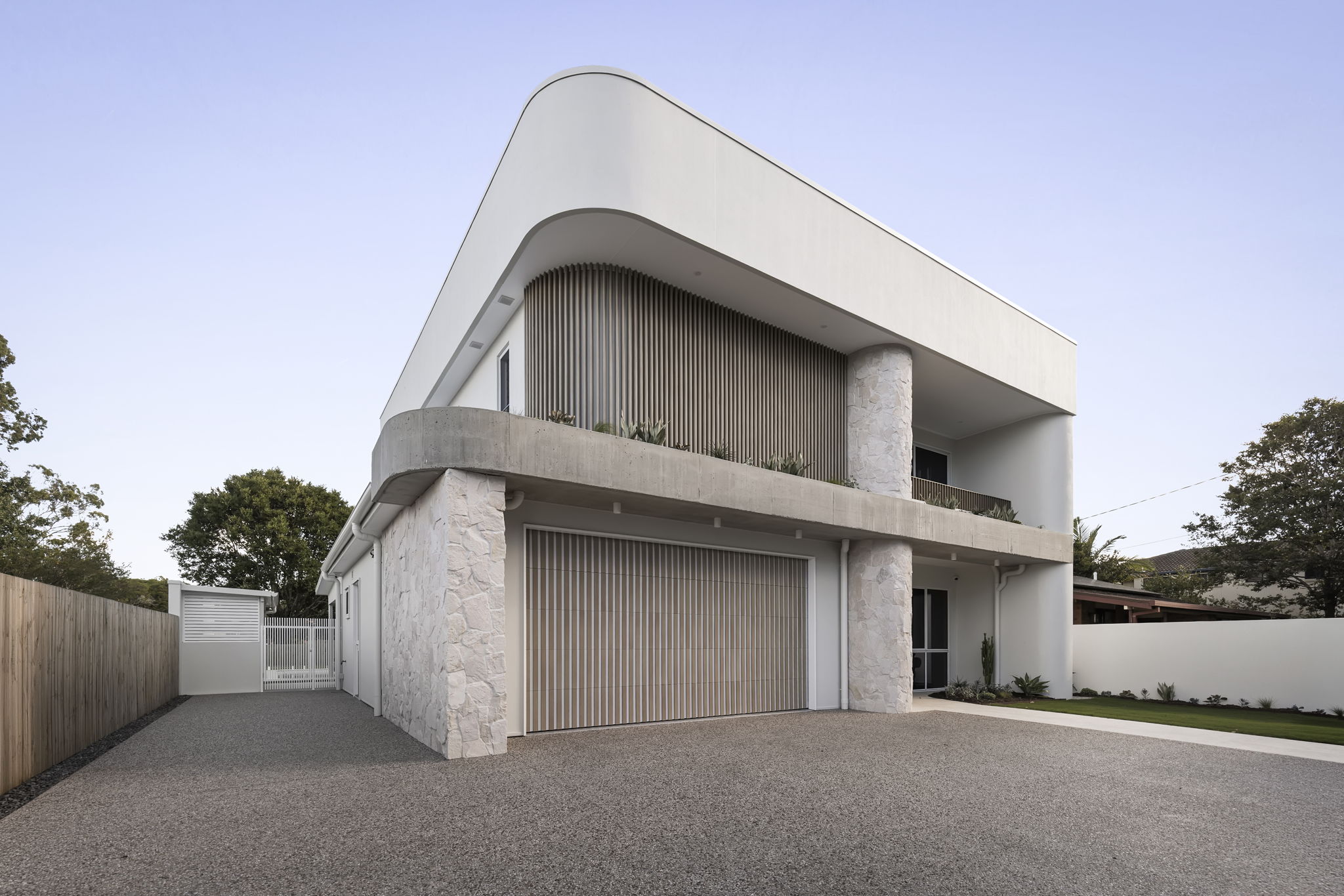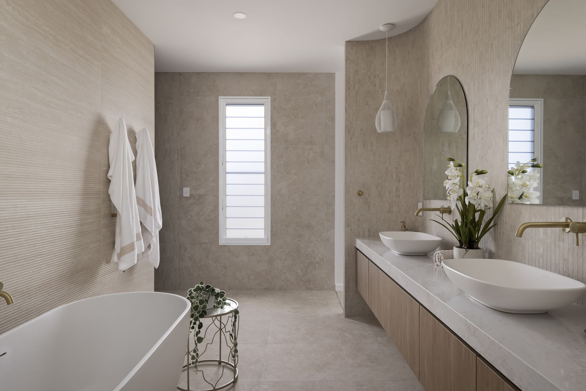Curved walls and high arches set the soft tone of the home complimented by the expansive voids and flowing lines that create a sense of volume while remaining deeply connected to family function. The mixture of carefully curated tones and textures with the Boston Oak fluting, porcelain tiles. French Oak flooring and stone feature walls create warmth and personality to each space. The striking spiral staircase serves as a centrepiece to the home, showcasing the purposeful and seamless design transitioning between spaces.