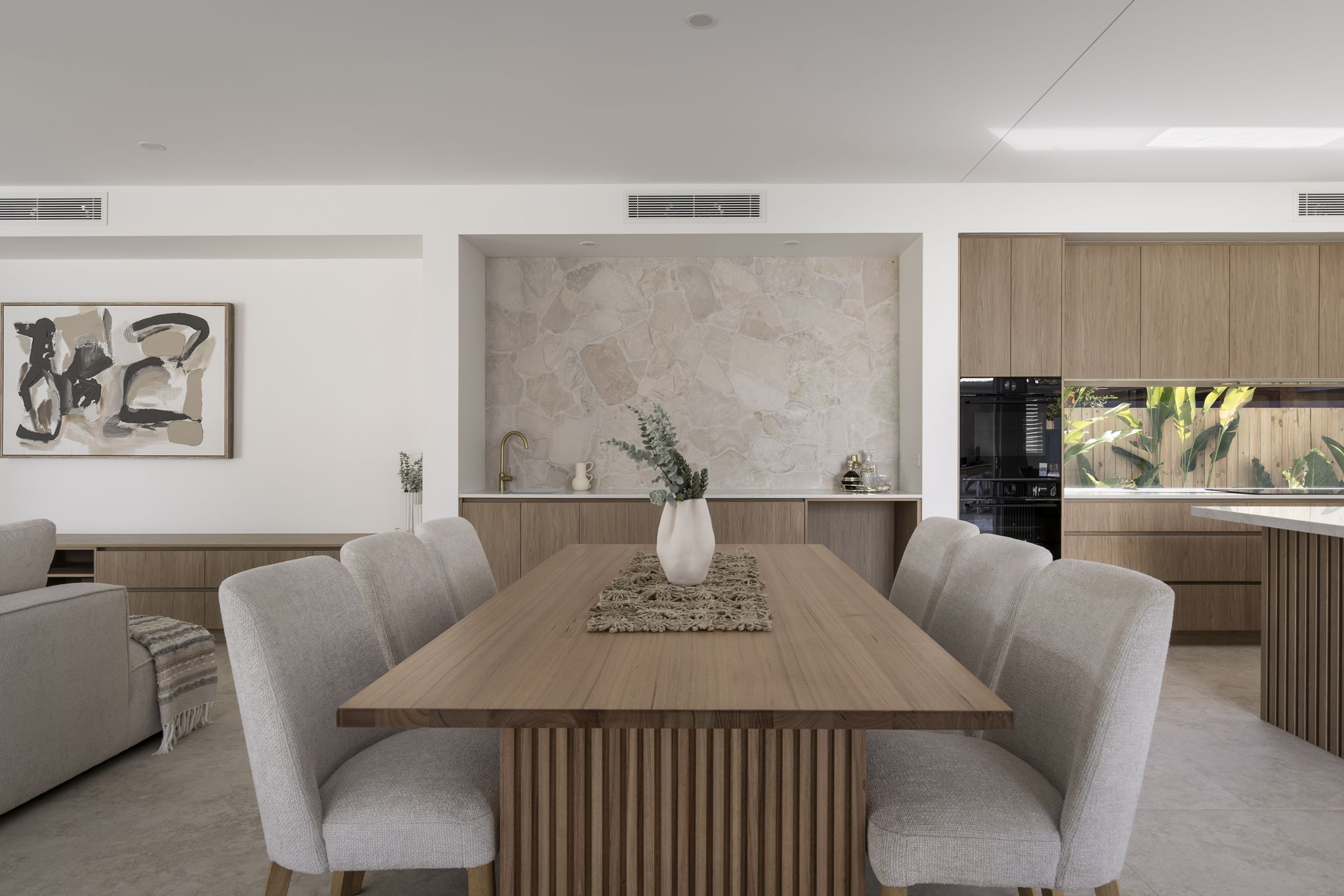 • Expansive open plan living and dining area with bar stone wall feature