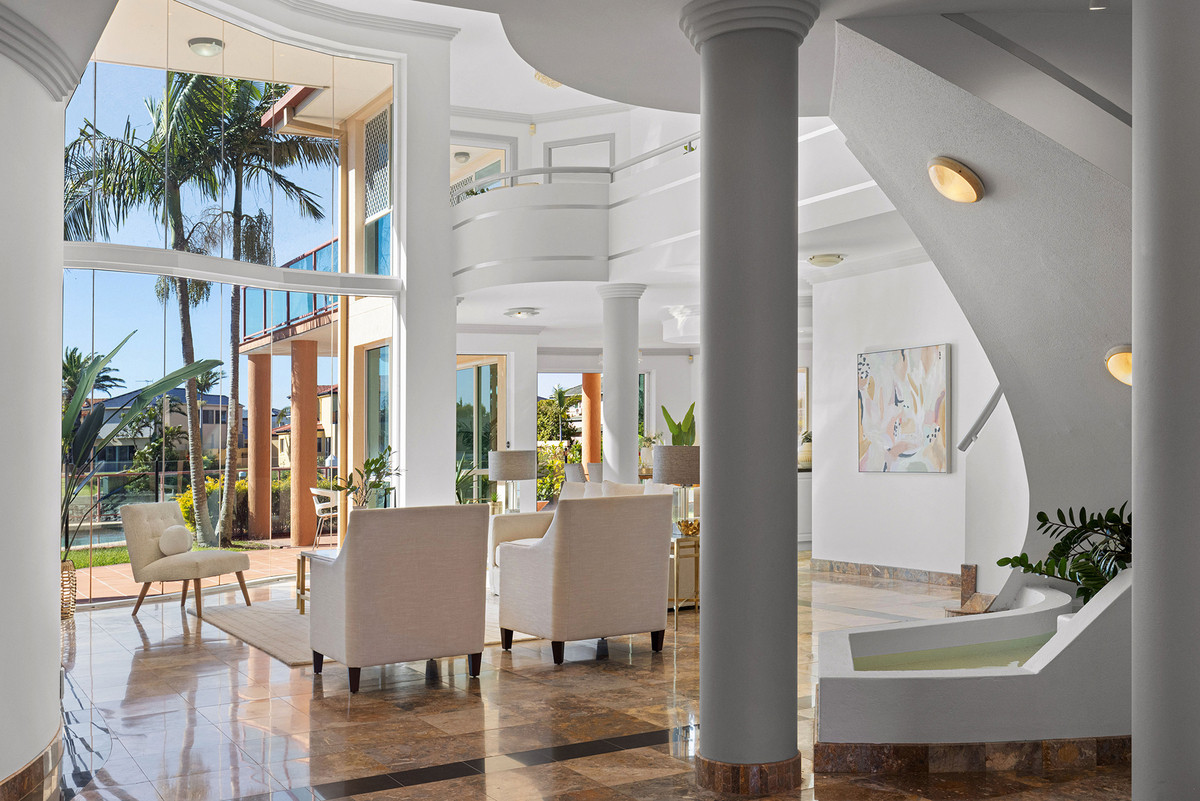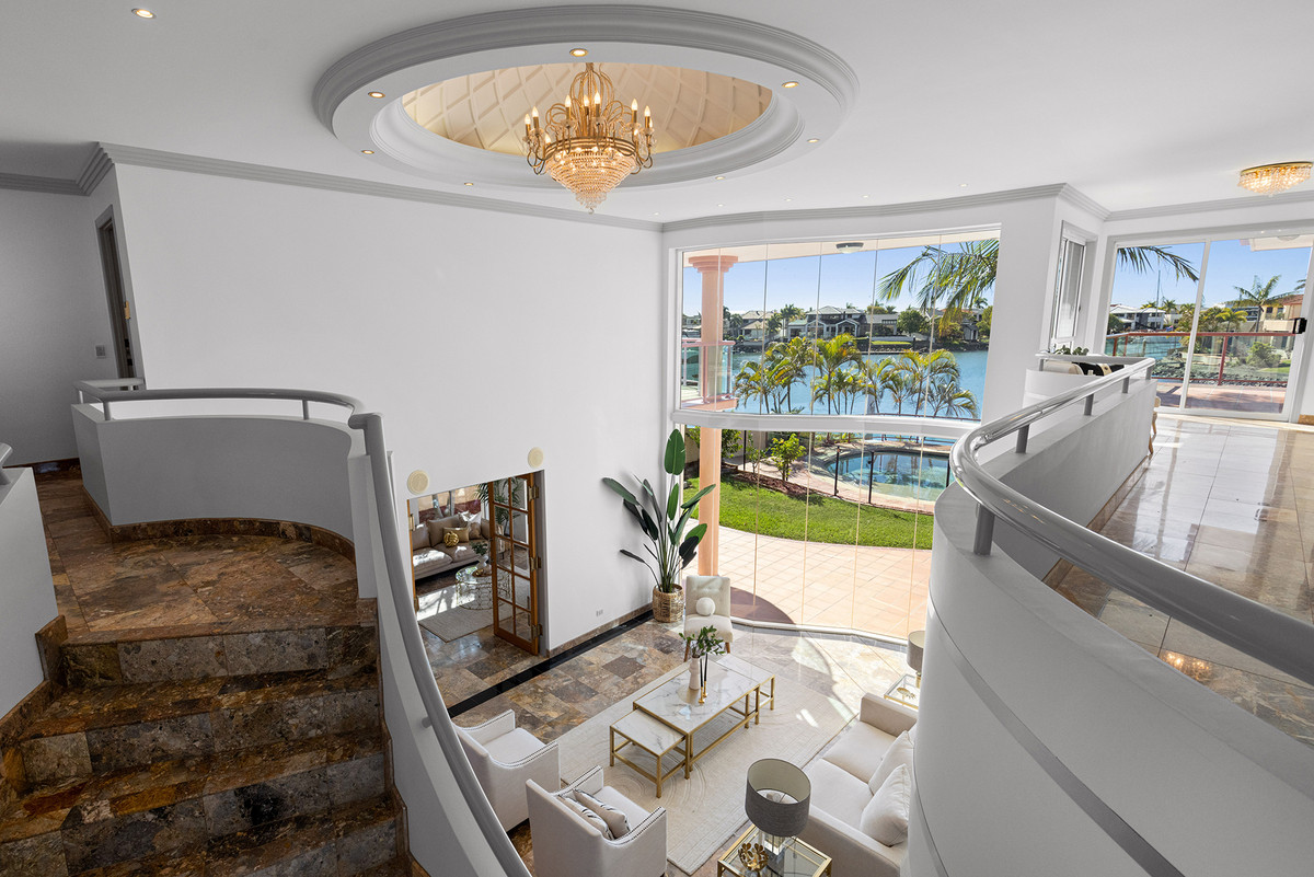 No detail has been spared in creating a residence that exudes sophistication and captures its privileged waterfront position. Gaze upon panoramic water views from both levels and multiple rooms, courtesy of double-height glass walls that offer a truly awe-inspiring panorama. The floor space completed with gorgeous marble stone including the curved staircase. The discerning homeowners can retreat to an upstairs master suite, complete with a private balcony overlooking the pool and bay. This extraordinary bedroom features an expansive walk-in robe and a stunning ensuite, adorned with a round jacuzzi bath and a separate shower. Alternatively, a downstairs master suite provides an equally indulgent lifestyle, boasting a generous walk-in robe and a sumptuous ensuite.