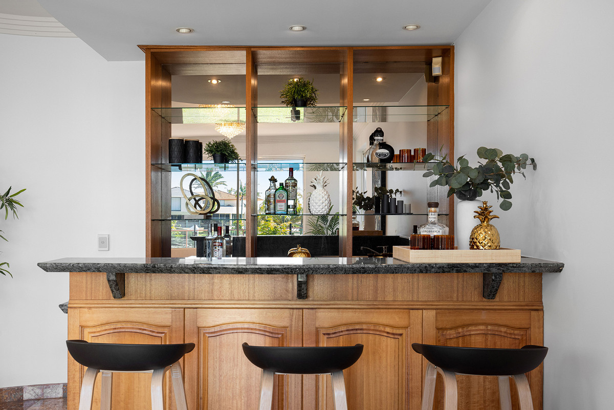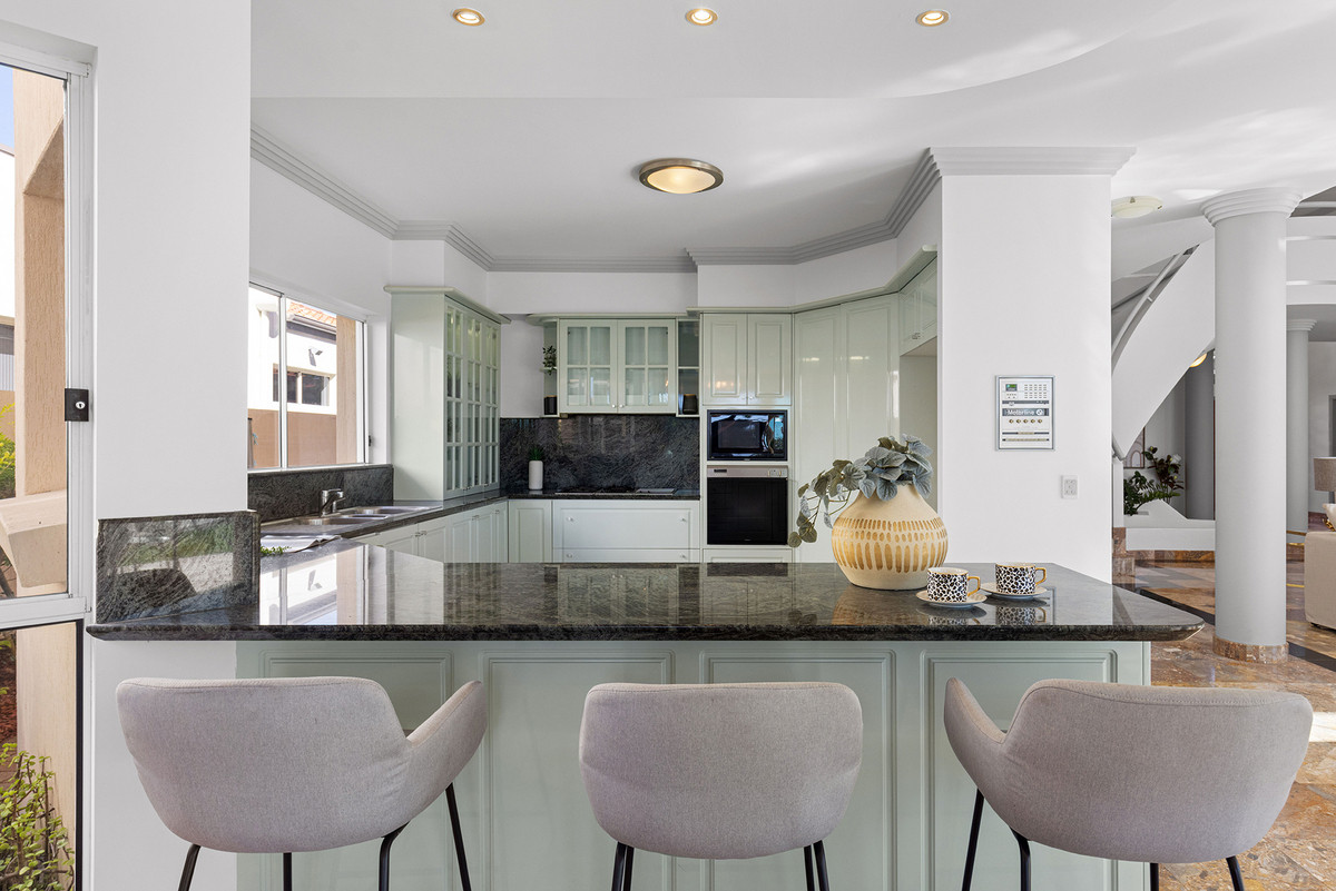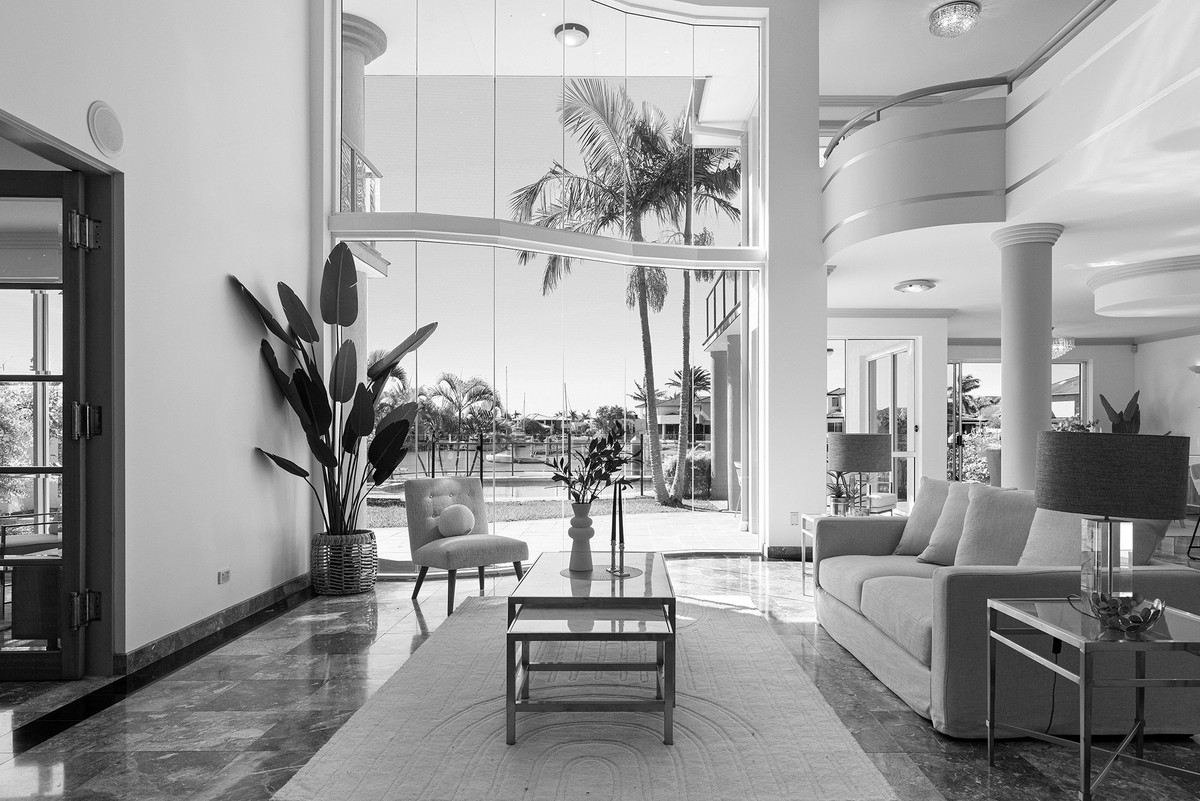 The living spaces within this abode are nothing short of irresistible. Discover an indoor water feature nestled beneath a spiral staircase, while a majestic double-height void showcases a dazzling chandelier. The open-plan living and dining areas flawlessly embrace the breathtaking view and seamlessly extend to an undercover alfresco space, creating an unparalleled setting for hosting unforgettable gatherings. If you relish in grand soirées, prepare to be captivated. Throughout the entire residence, you’ll revel in the extensive use of premium granite, suspended concrete floors, and lofty ceilings that evoke a sense of grandeur.