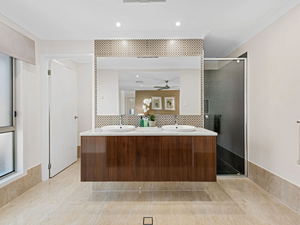Upstairs you will find the second living area, accompanied by a further four bedrooms, all with built in robes and ceiling fans. The oversized master bedroom with its deluxe ensuite with dual vanities and extra large shower is located in the back wing of the upper level.