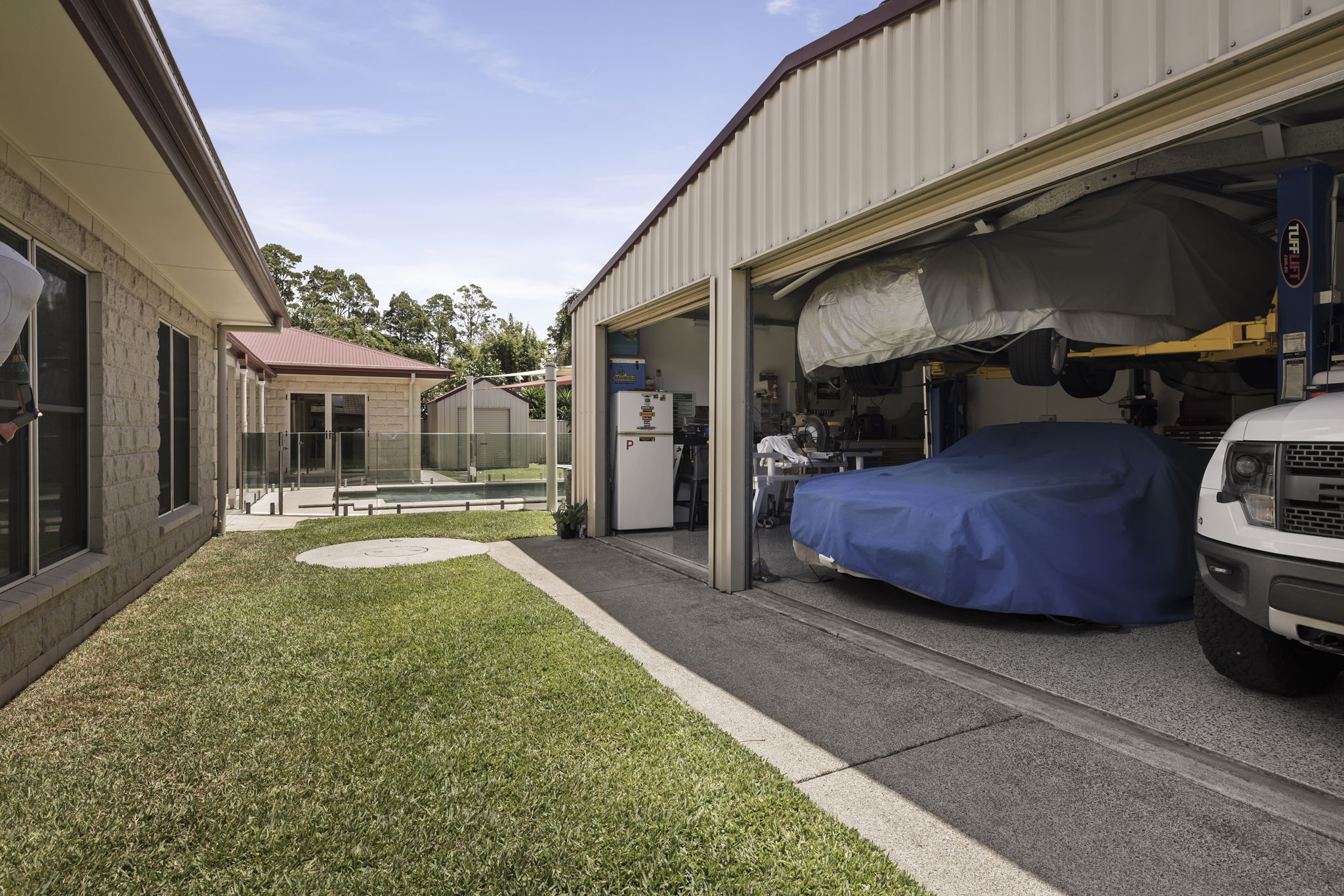 • Large triple bay shed with a car hoist, 12’x6′ in ground trampoline