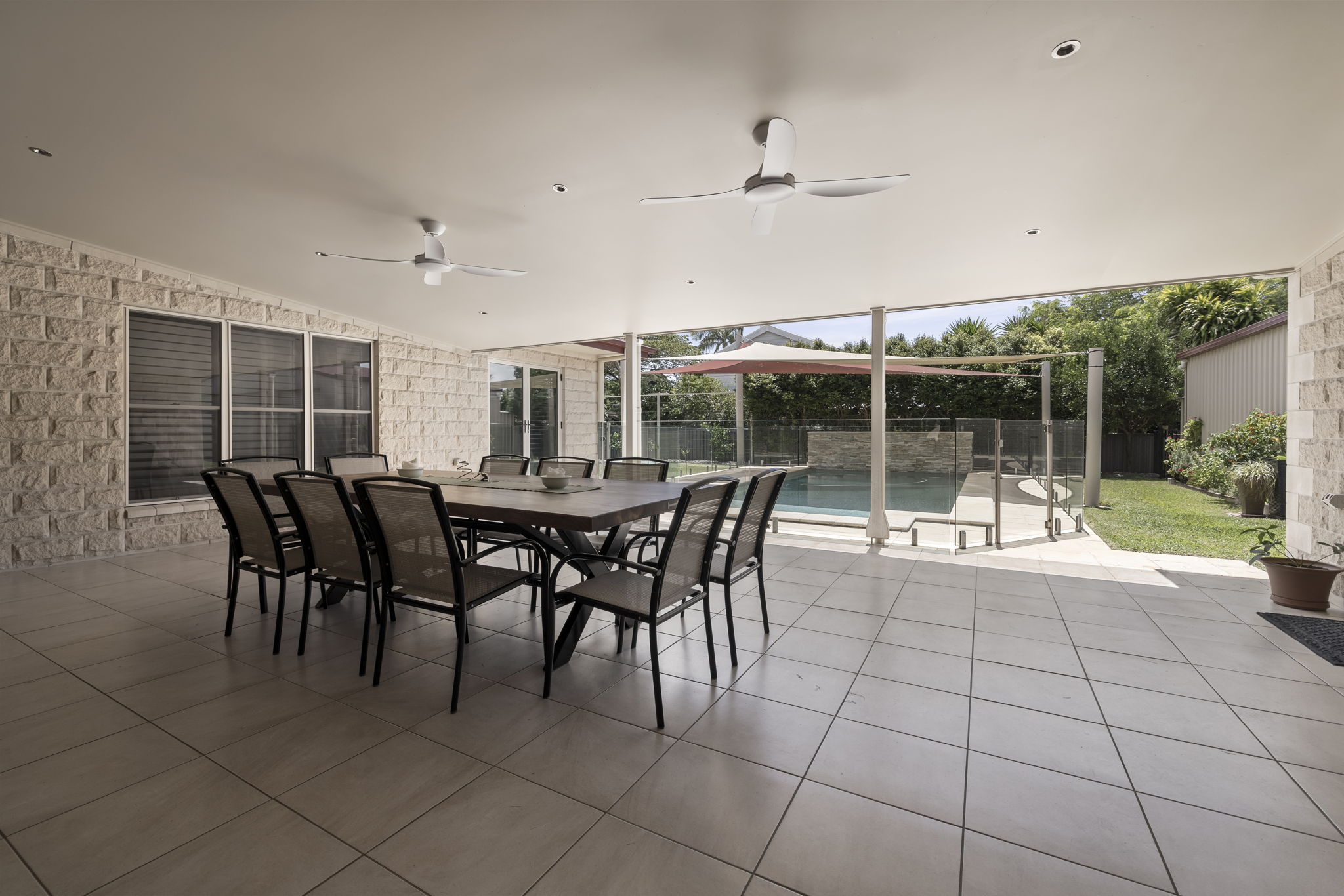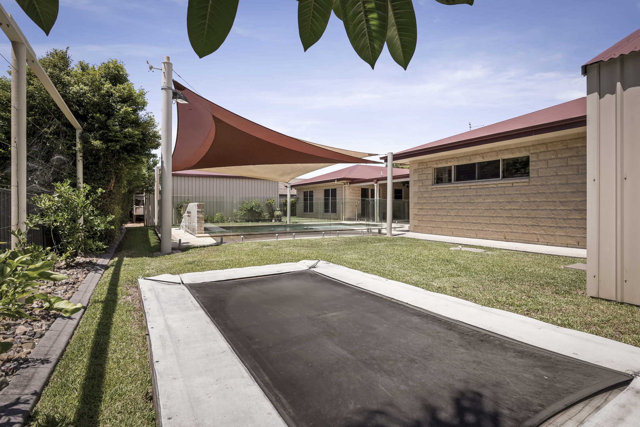 • Swimming pool with solar heating, waterfall feature and shade sails
