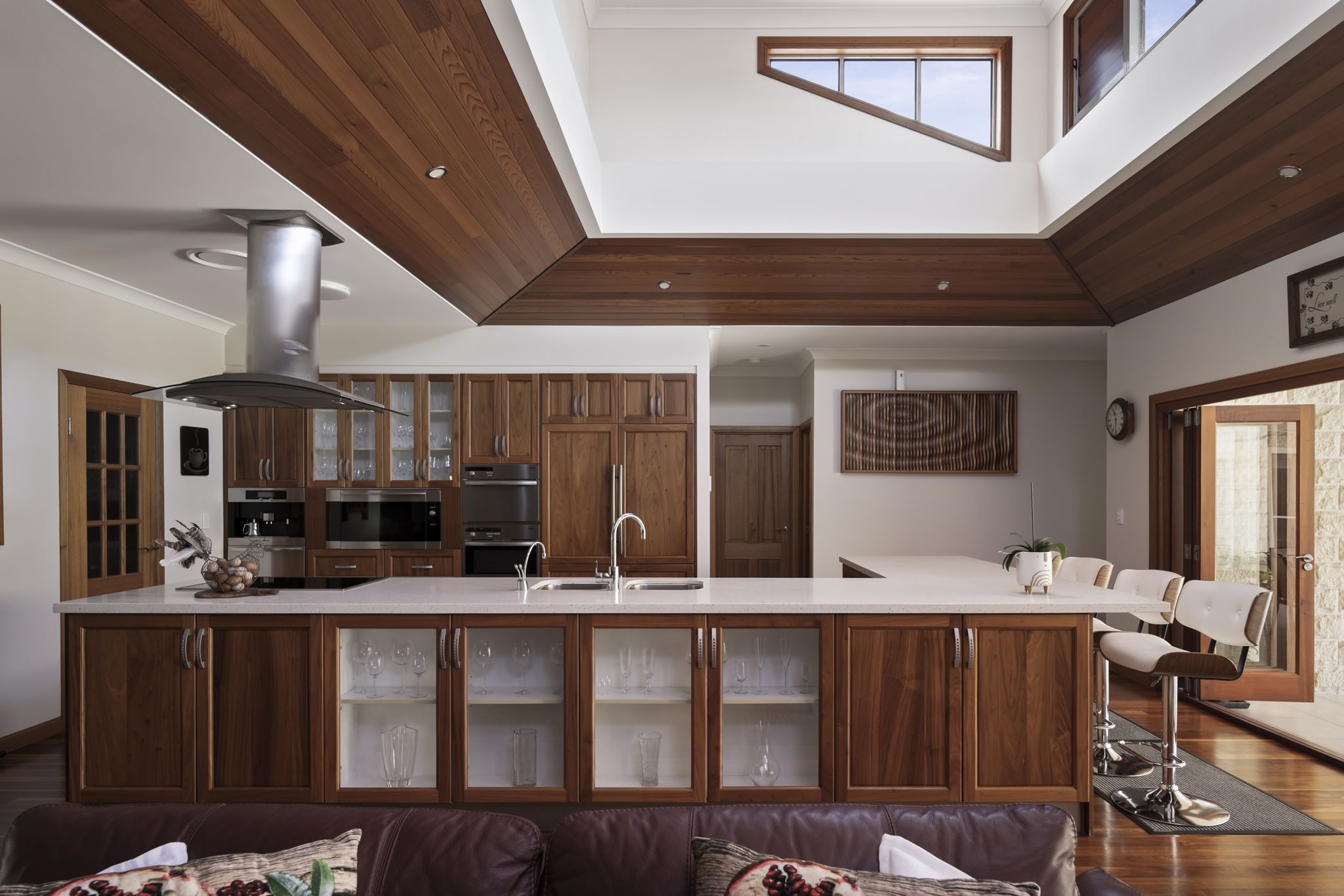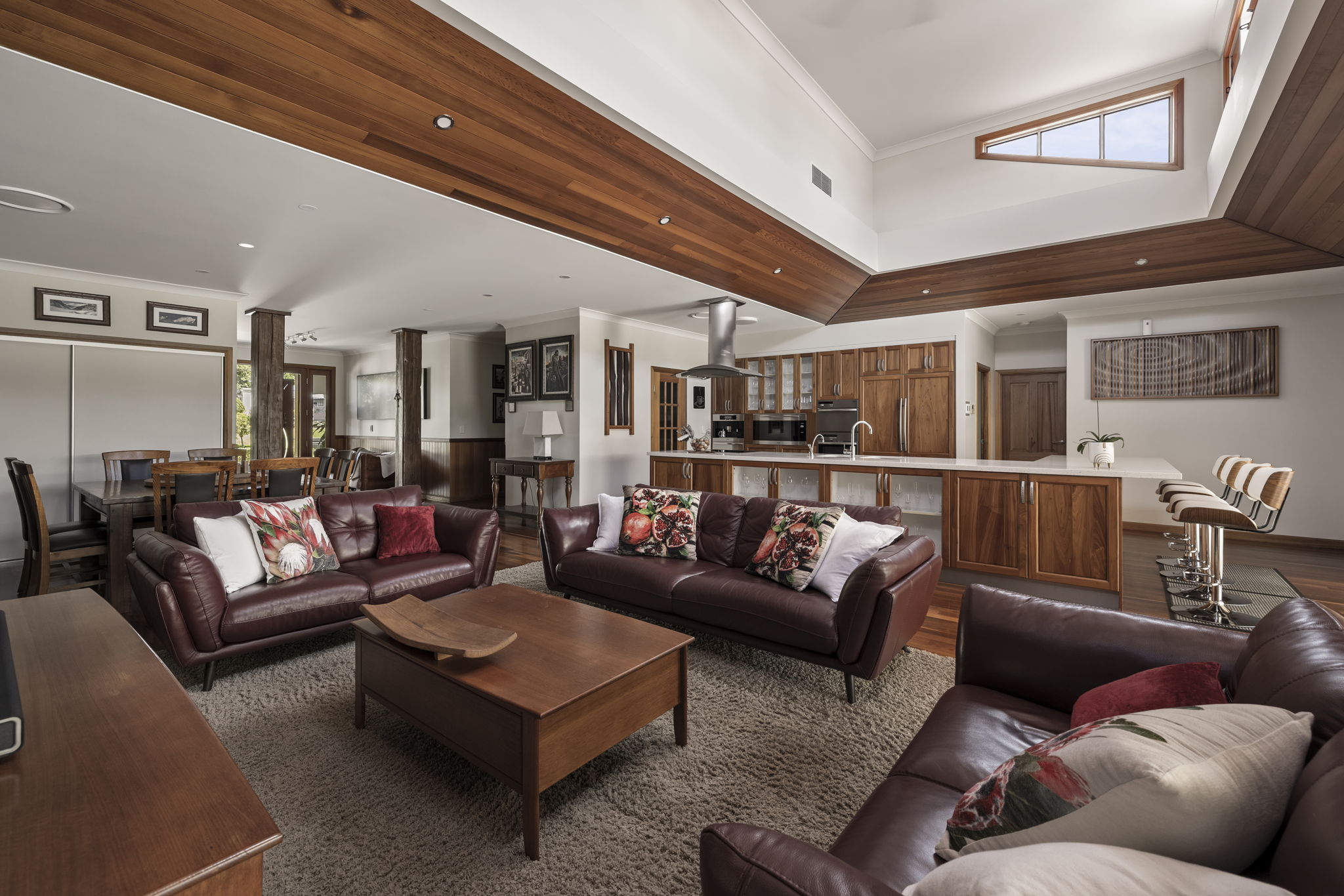 Multiple living and lounge areas provide outstanding space to relax and gather, enhanced by warm spotted gum timber flooring and soaring 9ft ceilings throughout. The home’s showpiece 15ft atrium above the main living and kitchen zone draws in an abundance of natural light, creating a bright, open and welcoming atmosphere.