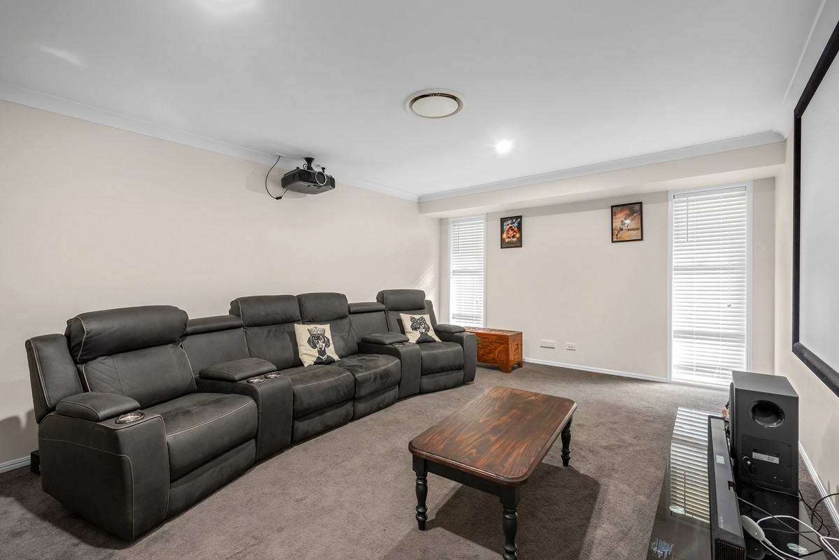 Inside, you’ll find a spacious single-story layout featuring an open-plan living, kitchen, and dining area. The master bedroom boasts a generous 5.6m x 4m size, walk-in wardrobe, and an ensuite with two sinks and a separate shower. There’s also room for an office and a media room, ensuring space for all your needs.